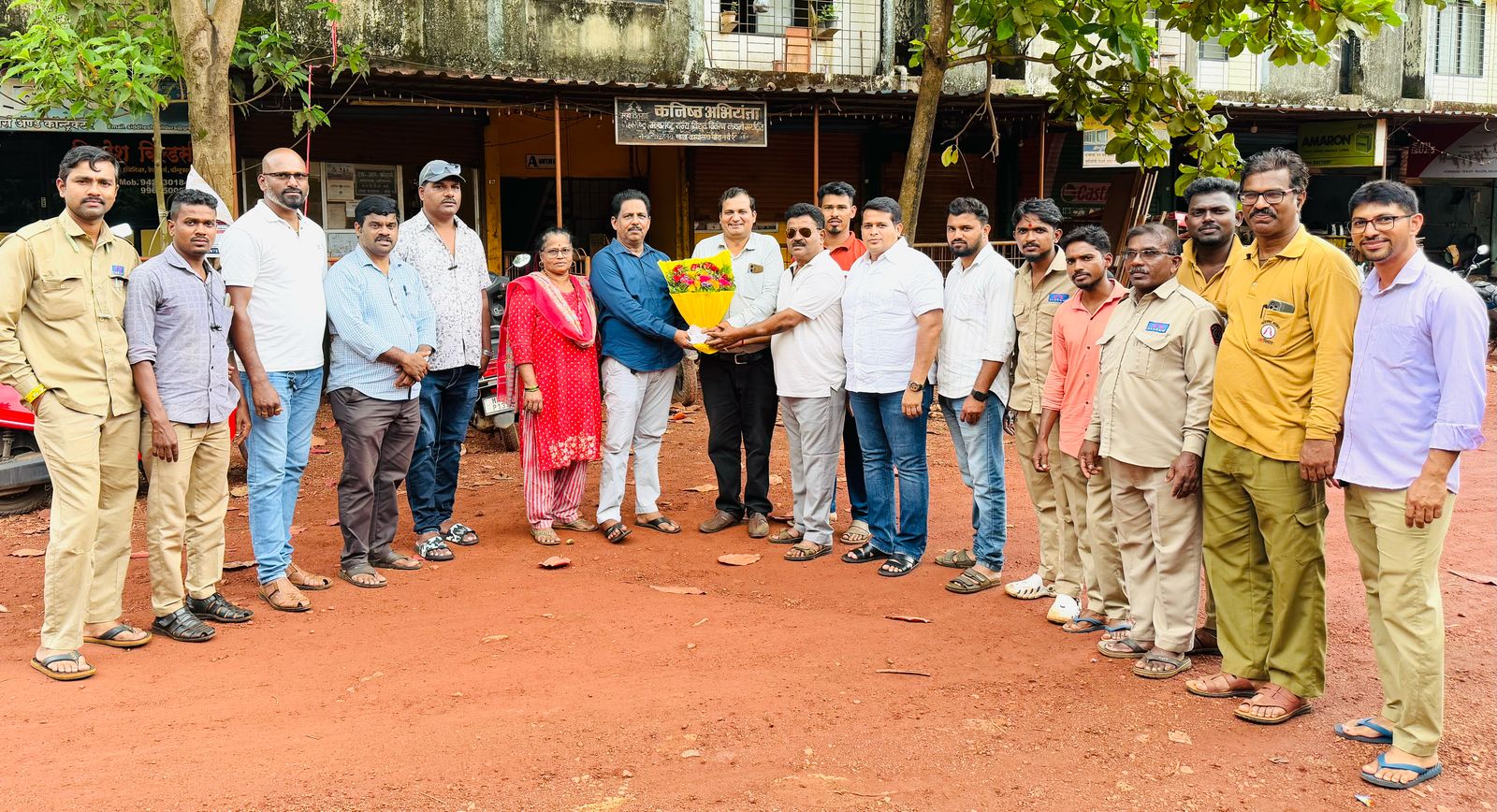 बांदा येथे महावितरणचे सहाय्यक अभियंता एस आर कोहळे यांना पुष्पगुच्छ देऊन शुभेच्छा देताना बांदा ग्रामस्थ. सोबत महावितरणचे कर्मचारी. (छायाचित्र- नीलेश मोरजकर)