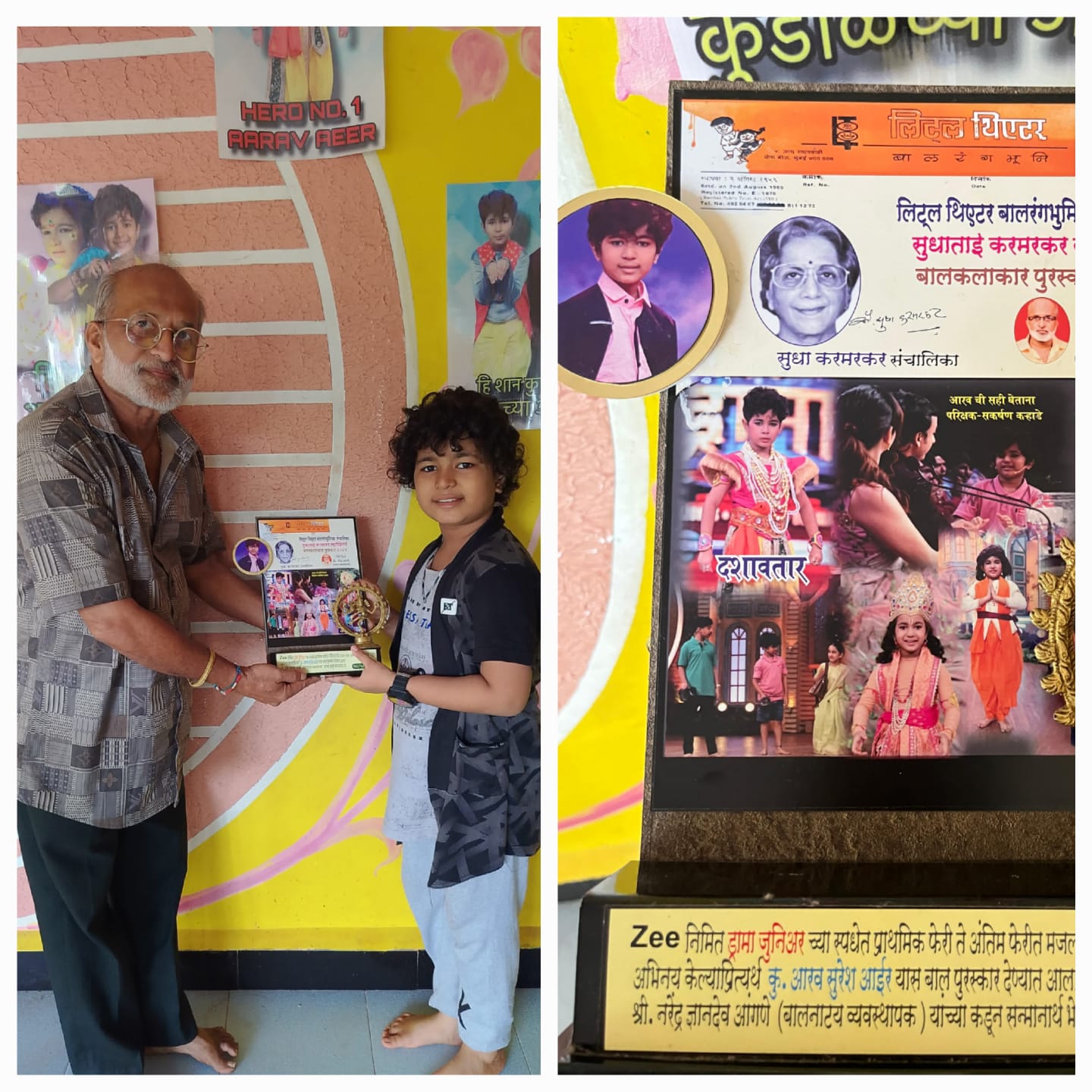 नाट्य व्यवस्थपक नरेंद्र आंगणे यांनी केला आरवचा गौरव:झी च्या ‘ड्रामा ज्युनियर’ रियालिटी शो मधील यशाबद्दल पुरस्कार..