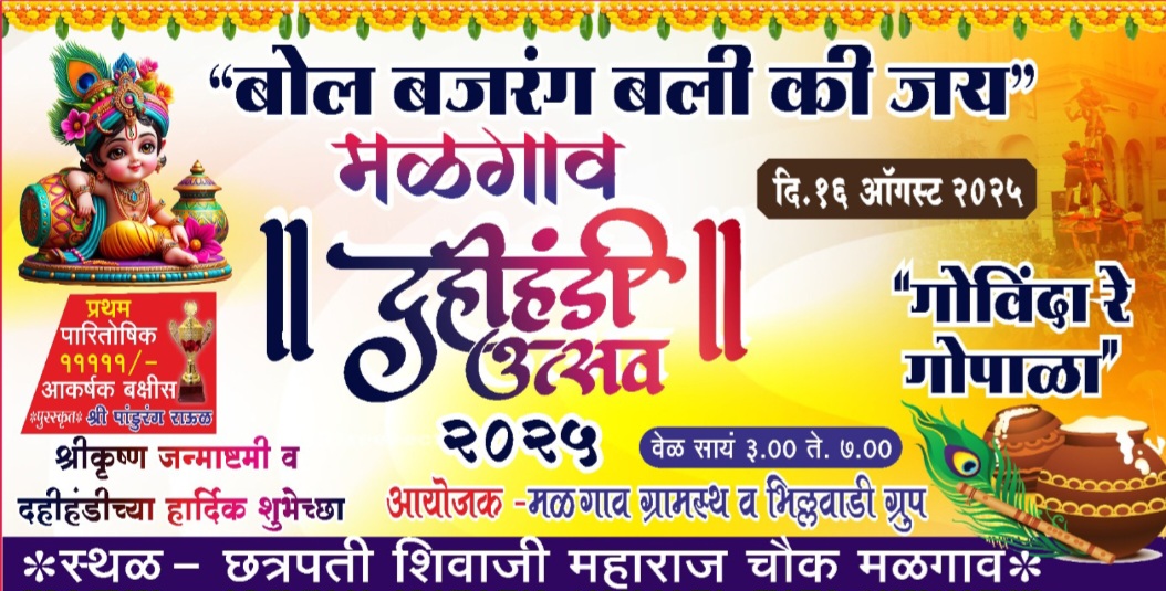 ⚡सावंतवाडी ता.१३-: श्रीकृष्ण जन्माष्टमीच्या निमित्ताने मळगाव ग्रामस्थ व भिलवाडी ग्रुप यांच्या संयुक्त विद्यमाने येत्या १६ ऑगस्ट रोजी छत्रपती शिवाजी महाराज चौक येथे दहीहंडी उत्सवाचे भव्य आयोजन करण्यात आले आहे.