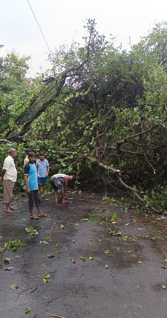 महान येथे वडाचे झाड कोसळल्याने त्याच्या फ़ांद्या रस्त्यावर आल्याने वाहतुकीस अडथळा निर्माण झाला होता. या घटनेची माहिती मिळताच पोलीस पाटील संदीप शिंदे यांनी स्थानिक ग्रामस्थांच्या सहकार्याने रस्त्यावर पडलेल्या झाडाच्या फांद्या बाजूला करून वाहतूक जाण्यासाठीचा मार्ग मोकळा करून दिला. त्यानंतर बांधकाम विभागाचे गावित यांनी घटनास्थळी पोहचून जेसीबीच्या सह्यायाने उर्वरित झाड रस्त्याच्या बाजूला केले.