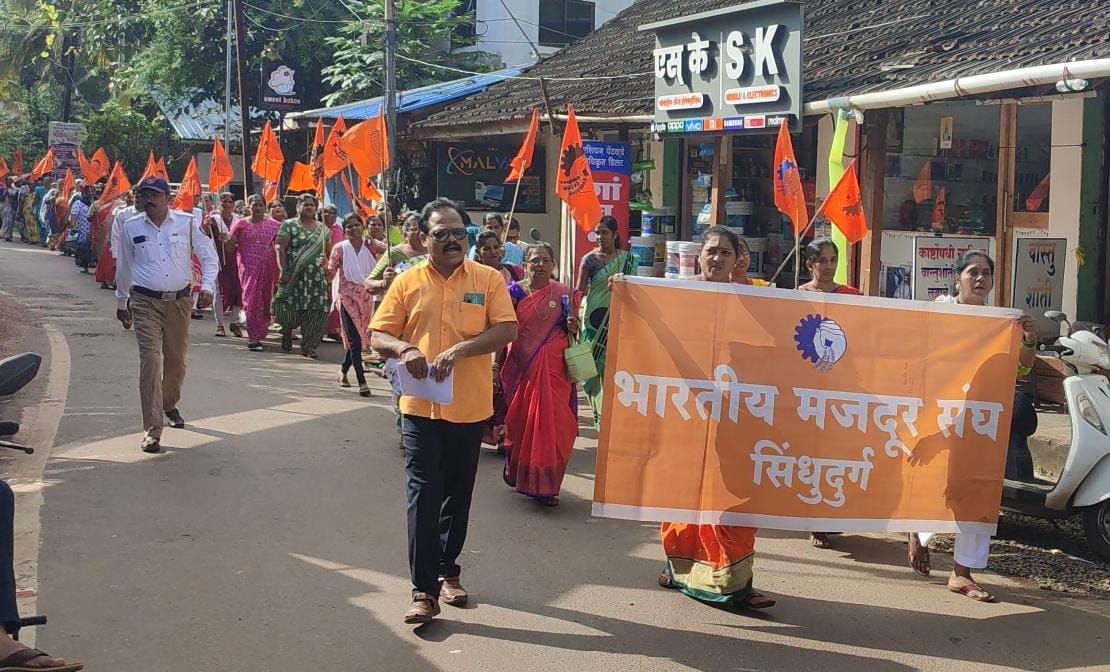 भारतीय मजदूर संघातर्फे आज दुपारी मालवण येथील मामा वरेरकर नाट्यगृहात महिलांचा मेळावा घेऊन त्यानंतर शहरातून रॅली काढण्यात आली. मामा वरेरकर नाट्यगृह ते भरड नाका येथून बाजारपेठ मार्गे पुन्हा नाट्यगृह अशी ही रॅली काढण्यात आली. भारतीय मजदूर संघाचा विजय असो, घरेलू कामगार संघाचा विजय असो, अशा घोषणा यावेळी देण्यात आल्या. यावेळी भारतीय मजदूर संघांचे प्रदेश सचिव हरी चव्हाण, विभाग संघटन मंत्री भगवान साटम, जिल्हा सचिव हेमंतकुमार परब, जिल्हा कोषाध्यक्ष ओंकार गुरव, तालुका प्रतिनिधी कल्पिता जोशी, जिल्हा प्रतिनिधी भाग्यश्री माळकर, तालुका प्रतिनिधी महेश सुर्वे आदी उपस्थित होते. या रॅलीसाठी ललित चव्हाण, निनाद बादेकर, शुभम लुडबे आदी उपस्थित होते.