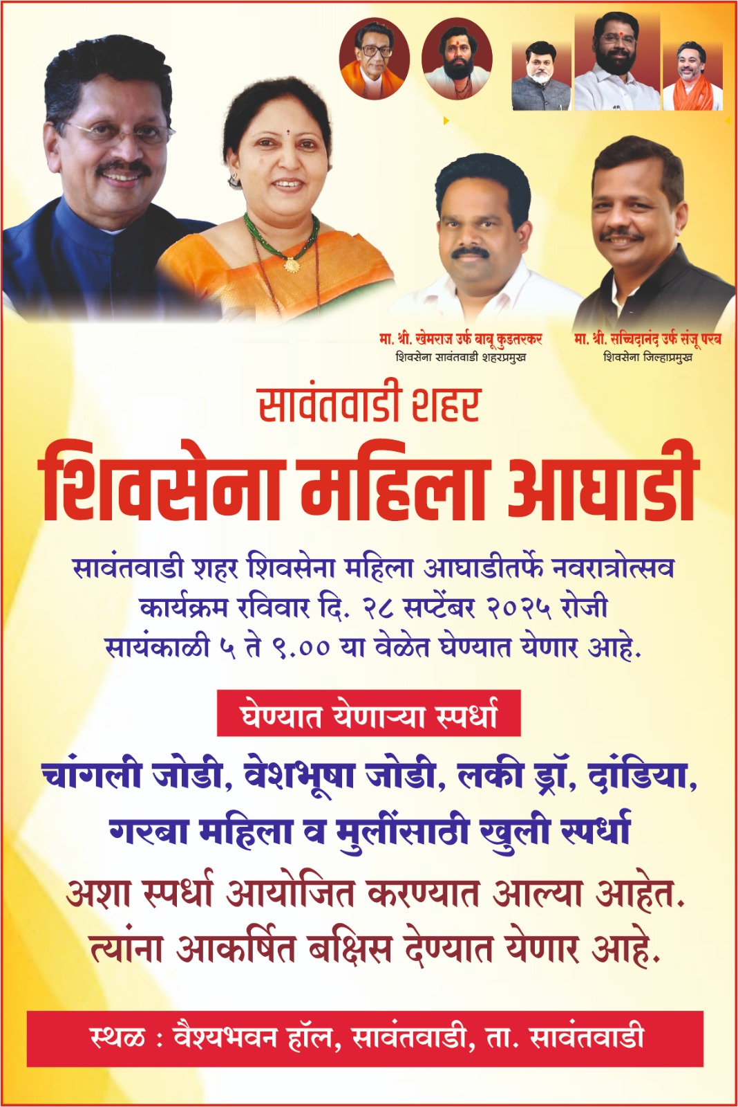 ⚡सावंतवाडी ता.२८-: सावंतवाडी शहर महिला शिंदे शिवसेनेच्या वतीने नवरात्र उत्सव कार्यक्रमाचे आज आयोजन करण्यात आले आहे. आज सायंकाळी पाच ते रात्री था यावेत वैश्य भवन येथे नवरात्र उत्सव कार्यक्रम आयोजित करण्यात आला आहे. यानिमित्त डान्स, दांडिया आदी स्पर्धांचे आयोजन करण्यात आले आहे. सर्वांनी लाभ घ्यावा,असे आवाहन महिला शहर प्रमुख भारती मोरे यांनी केले आहे.