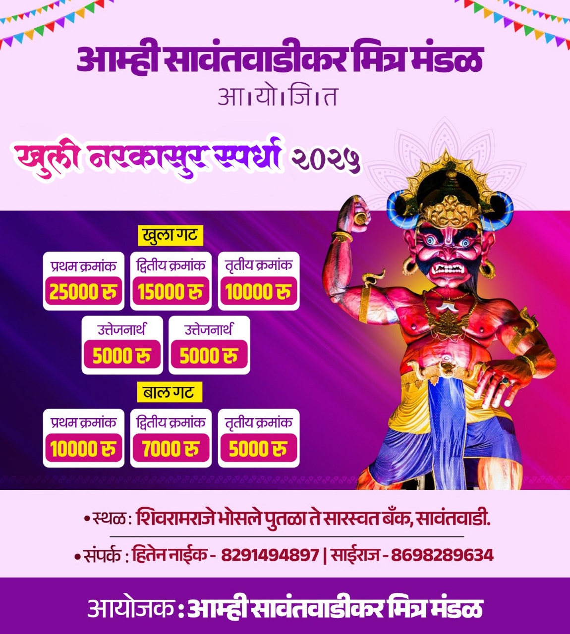 ⚡सावंतवाडी ता.०६-: आम्ही सावंतवाडीकर मित्र मंडळ यांच्या माध्यमातून १९ रोजी मोती तलाव सावंतवाडी शिवरामराजे भोसले पुतळा ते सारस्वत बँक येते भव्य नरकासुर स्पर्धेचे आयोजन करण्यात आली आहे. ही स्पर्धा खुला गट व बाल गट अशी घेतली जाणार आहे. मोठ्या गटासाठी प्रथम क्रमांक २५,००० द्वितीय क्रमांक १५००० तृतीय क्रमांक १०,००० असे ठेवण्यात आले आहेत