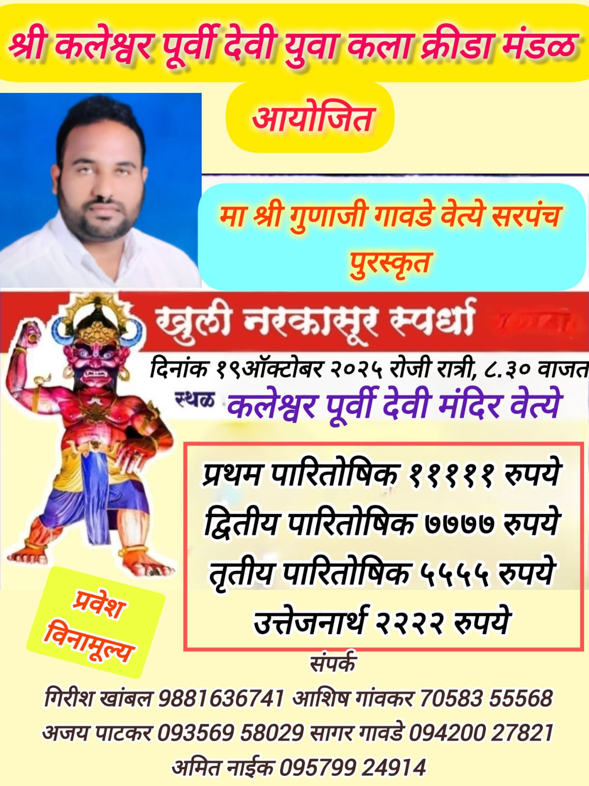 ⚡सावंतवाडी ता.०८-: वेत्ये कलेश्वर पूर्वी देवी युवा कला क्रीडा मंडळातर्फे आयोजित करण्यात आलेल्या खुल्या नरकासुर स्पर्धेला उत्स्फूर्त प्रतिसाद मिळत आहे. मा. श्री. गुणाजी गावडे (सरपंच, वेचे) यांच्या अध्यक्षतेखाली हा कार्यक्रम पार पडणार आहे. ही स्पर्धा कलेश्वर पूर्वी देवी मंदिर प्रांगणात रात्री ८:३० वा. आयोजित करण्यात आली आहे.