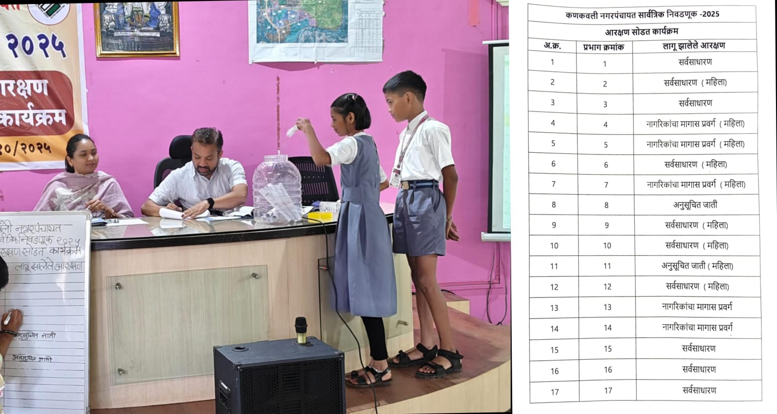 कणकवली : राज्यातील नगरपंचायती व नगरपरिषदांच्या सार्वत्रिक निवडणुकीची तयारी वेगाने सुरू झाली असून, या पार्श्वभूमीवर कणकवली नगरपंचायत सार्वत्रिक निवडणूक २०२५ साठीची आरक्षण सोडत बुधवारी येथील नगरपंचायतच्या सभागृहात पार पडली. नवीन आदेशानुसार यावर्षीपासून आरक्षण निश्चित