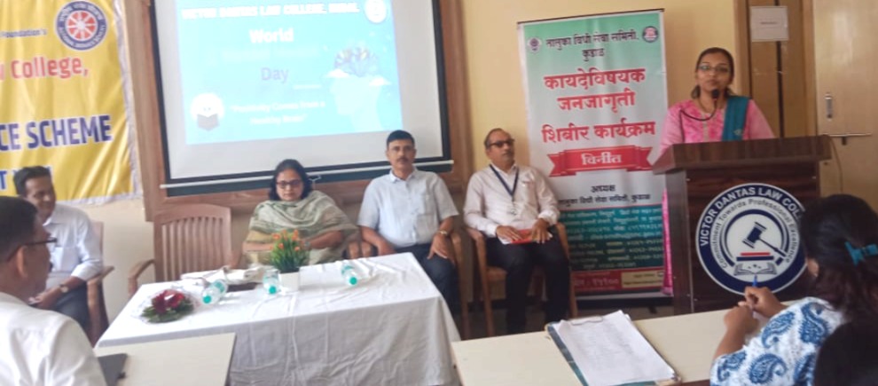 ⚡कुडाळ ता.१०-: येथील दिवाणी न्यायालय, कुडाळ तथा तालुका विधी सेवा समिती कुडाळ व वकील संघटना कुडाळ यांच्या सयुक्त विदयमाने व्हीक्टर डॉन्टस लॉ कॉलेज कुडाळ येथे जागतीक मानसिक आरोग्य दिनाच्या निमित्ताने एका विशेष कार्यक्रमाचे आयोजन करण्यात आले होते. यावेळी मानसिक आरोग्य याविषयावर तज्ज्ञांनी मार्गदर्शन केले.