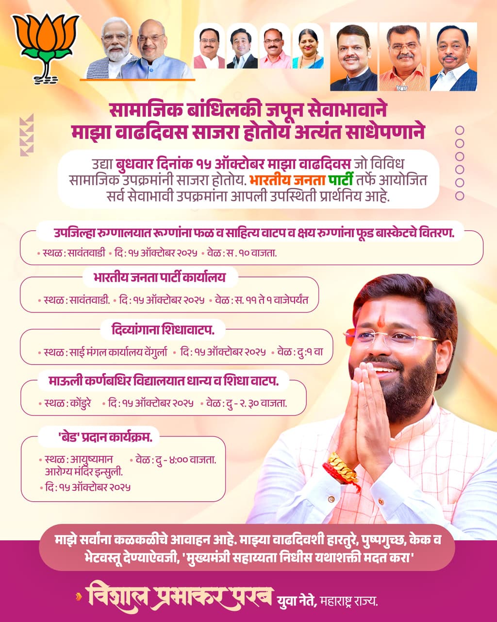 विशालजी परब हे सकाळी ११ ते दुपारी १ या दरम्यान सावंतवाडी येथील भाजप पक्ष कार्यालयात शुभेच्छा स्वीकारण्यासाठी उपस्थित राहणार आहेत. यावेळी कार्यकर्ते आणि नागरिकांना हार, पुष्पगुच्छ, केक किंवा भेटवस्तू देण्याऐवजी मुख्यमंत्री सहाय्यता निधीस हातभार लावण्याचे आवाहन करण्यात आले आहे.सामाजिक बांधिलकीचा आदर्श निर्माण करण्याचा प्रयत्न करताना विशालजींनी नागरिकांना थेट शुभेच्छा देण्यासाठी आणि संवाद साधण्यासाठी उपस्थित राहण्याचे आवाहन केले आहे.