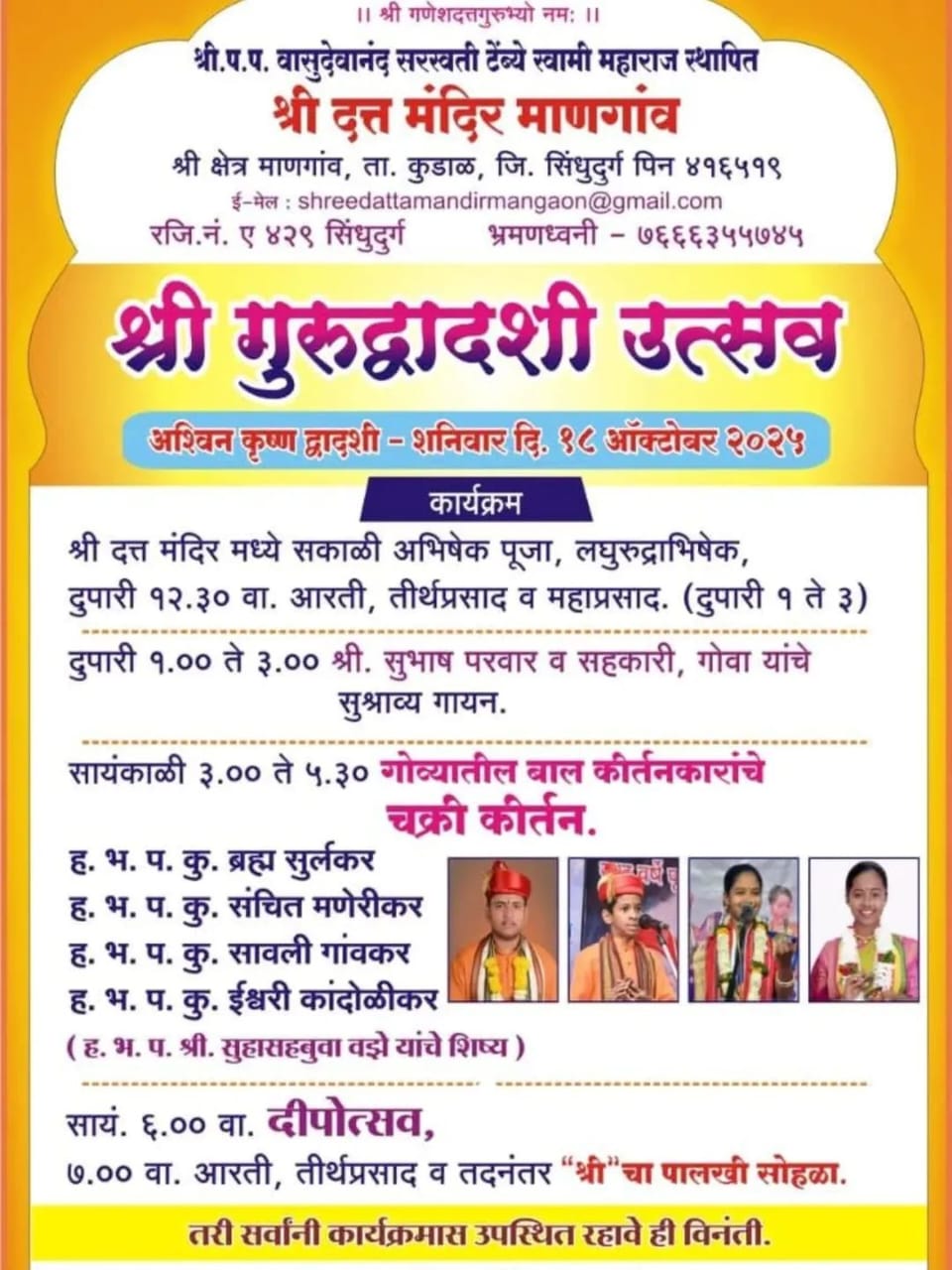⚡सावंतवाडी ता.१६-: श्री. प. प. वासुदेवानंद सरस्वती टेंबे स्वामी महाराज यांच्या स्थापित श्री दत्त मंदिर, माणगाव (ता. कुडाळ) येथे येत्या शनिवार दि. १८ ऑक्टोबर २०२५ रोजी श्री गुरुद्वादशी उत्सव मोठ्या भक्तीभावाने साजरा करण्यात येणार आहे.