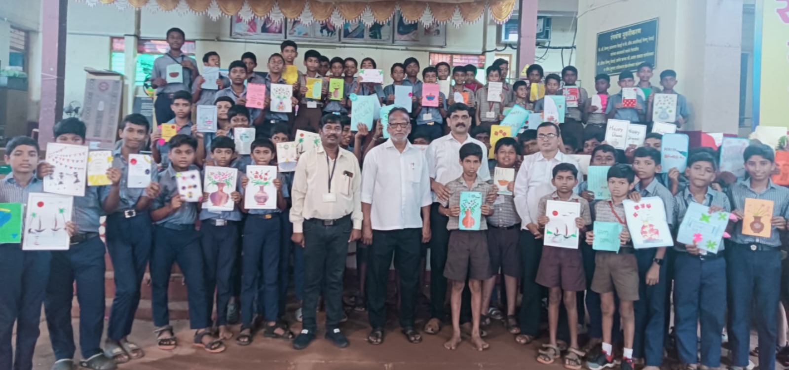 कोलाज काम, पोस्टर कलर, कलर पेन्सिल, स्केच पेन असे कलाविषयक साहित्याचा वापर करून छान छान शुभेच्छा कार्ड मुलांनी तयार केली. यामध्ये प्रथम क्रमांक योगिनी लक्ष्मण खोर्जुवेकर इयत्ता आठवी, द्वितीय क्रमांक खुशी कृष्णा कोचरेकर इयत्ता सातवी, तृतीय क्रमांक पूर्वा प्रकाश मुणगेकर इयत्ता सातवी आणि उत्तेजनार्थ प्रथम अंतरा सत्यवान दुतोंडकर इयत्ता सातवी तर उत्तेजनार्थ द्वितीय दूर्वा दत्तात्रय म्हैसकर याना मिळाला.