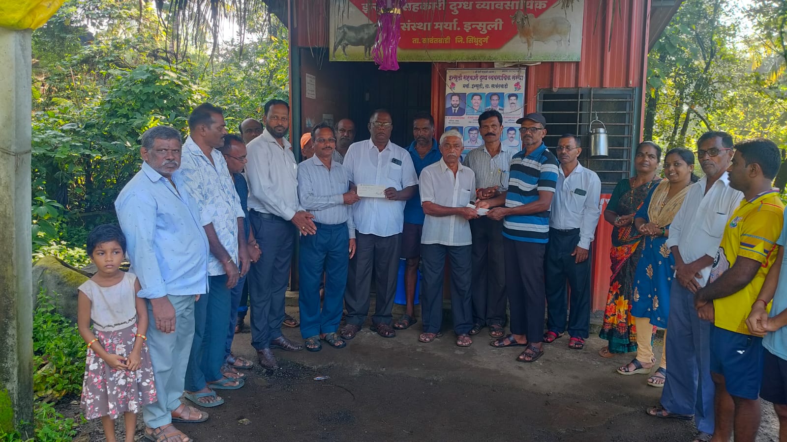 इन्सुली सहकारी दुग्ध संस्थेचा बोनस चेक देताना सरपंच गंगाराम वेंगुर्लेकर, अध्यक्ष गुरुनाथ पेडणेकर, जगन्नाथ झाट्ये व संजय सावंत आदी मान्यवर.