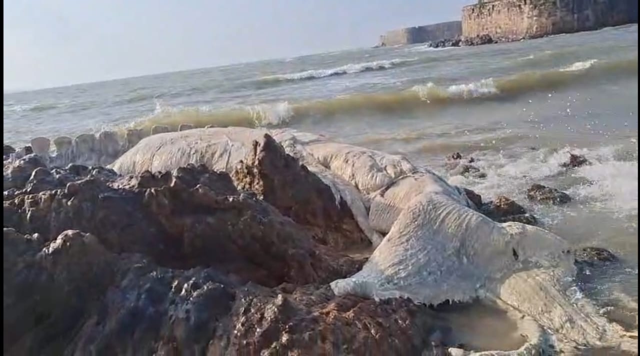 समुद्रातील वादळ सदृश परिस्थितीमुळे गेले काही दिवस किनारपट्टी भागात मुसळधार पाऊस कोसळत आहे. काल रात्री मुसळधार पाऊस कोसळला. समुद्राला आलेल्या उधाणात मध्यरात्री किल्ले सिंधुदुर्ग लगतच्या खडकाळ भागात एक भलामोठा कुजलेल्या अवस्थेतील शार्क माशाचा सांगाडा अडकला. आज सकाळी किल्ल्यातील स्थानिक रहिवासी व किल्ले सिंधुदुर्ग प्रवासी होडी वाहतूक संघटनेचे अध्यक्ष मंगेश सावंत यांना हा माशाचा सांगाडा दिसून आला. सुमारे १५ ते १७ फूट लांबीचा हा मासा असून तो पूर्णतः कुजला आहे. माशाचा तोंडाचा भाग अस्तित्वात नाही तर अन्य भागाचा सांगाडा व मांस असल्याचे दिसून येत आहे. सध्या समुद्र खवळलेला आहे. त्यामुळे या माशाची विल्हेवाट लावण्यास संबंधित यंत्रणा तेथपर्यंत पोचणे कठीण आहे. समुद्राला पुन्हा उधाण आल्यास हा सांगाडा पुन्हा समुद्रात वाहून जाण्याची शक्यताही श्री. सावंत यांनी वर्तविली आहे.