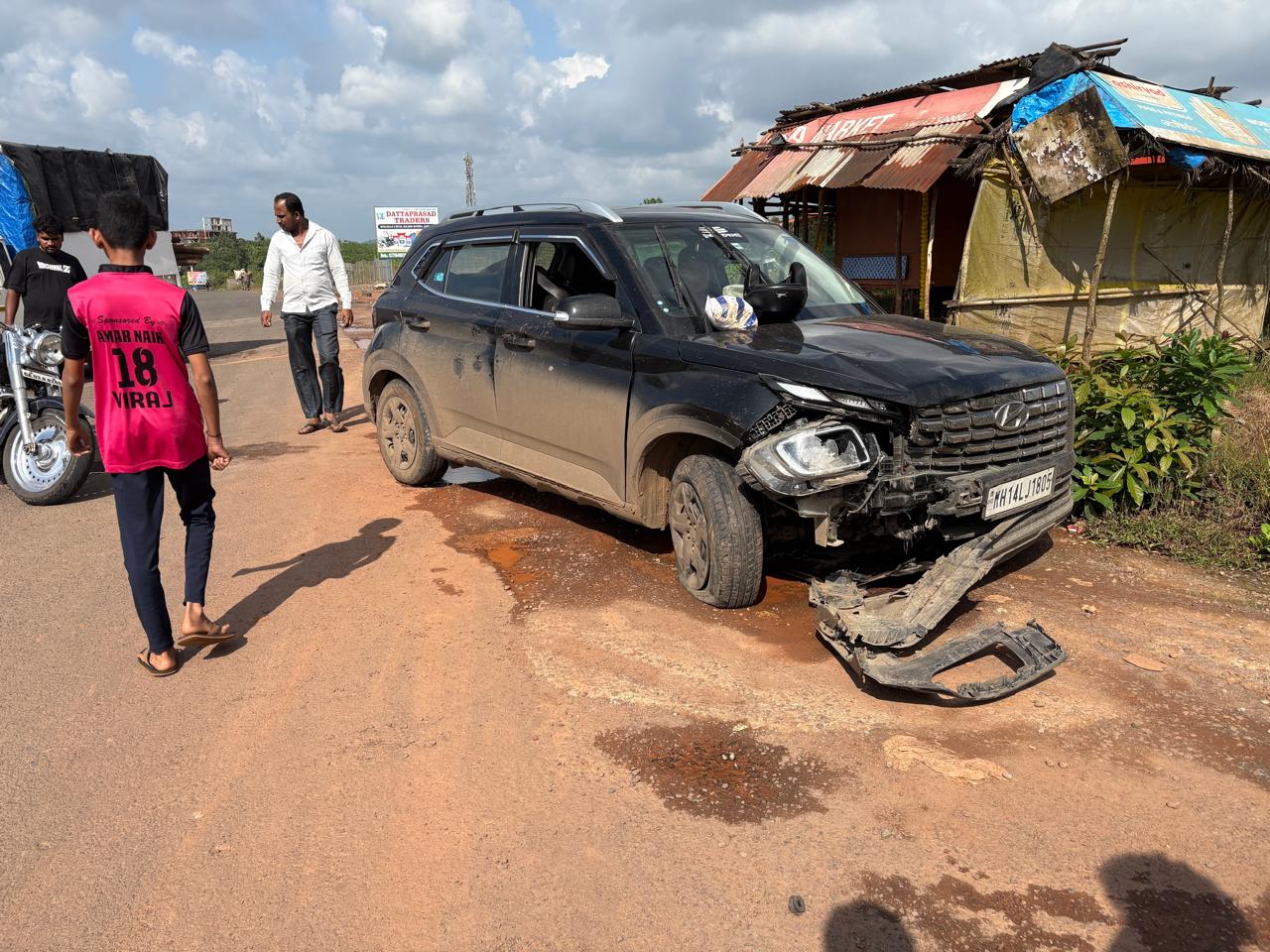 अपघातग्रस्त मोटार भरधाव वेगात पुण्याहून गोव्याच्या दिशेने जात होती. रस्त्यावर गतिरोधकाचा अंदाज न आल्याने मोटारीची समोरील दुचाकीला जोरदार धडक बसली. दुचाकी त्याच्या पुढे असलेल्या मोटारीवर जाऊन आदळली. यामध्ये दुचाकी चालकाला किरकोळ दुखापत झाली. वाहनांचे मात्र मोठ्या प्रमाणात नुकसान झाले.