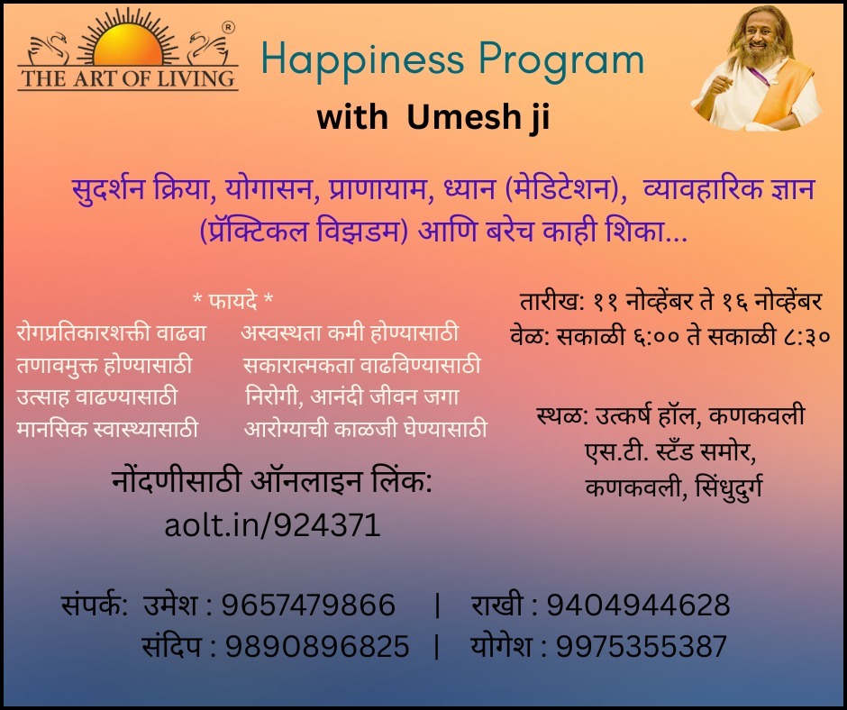 कुडाळ : आर्ट ऑफ लिविंगच्या माध्यमातून कणकवली मध्ये हॅपिनेस प्रोग्राम अर्थात आनंद अनुभुती शिबिराचे आयोजन करण्यात आले आहे. मंगळवार दि. ११ नोव्हेंबर ते रविवार १६ नोव्हेम्बर २०२५ या कालावधीत रोज सकाळी ६ ते ८.३० या वेळेत हॉटेल उत्कर्ष, एसटी स्टँड समोर, कणकवली येथे हे शिबीर होणार आहे. जास्तीत जास्त संख्येने या शिबिरात सहभागी व्हावे असे आवाहन आयोजकांनी केले आहे.