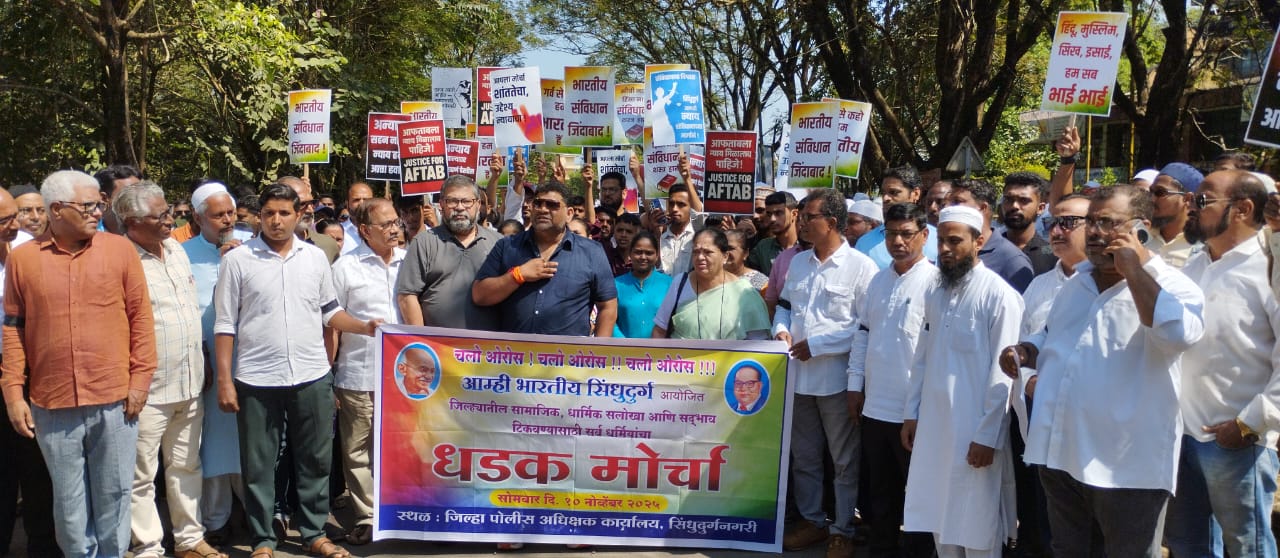 सिंधुदुर्ग जिल्ह्यात सामाजिक सलोखा राहावा प्रत्येक नागरिकांना संविधानाने दिलेल्या हक्का नुसार निर्भयपणे व्यवसाय करता यावा यासाठी समाजात अशांतता पसरविणाऱ्यांवर योग्य ती कारवाई करावी जिल्ह्यात सर्व धर्मीय एकोप्याने व सलोख्याने नांदत असताना अल्पसंख्यांक बांधवांना धमकावण्याचे व त्यांचे व्यवसाय बंद पाडण्याचे प्रकार वारंवार घडत आहेत अशा व्यक्तींना आळा घालावा या मागणीसाठी आज आम्ही भारतीय च्या वतीने सर्व धर्मीय बांधवांनी जिल्हा पोलीस अधीक्षक कार्यालयावर मोर्चा काढला
