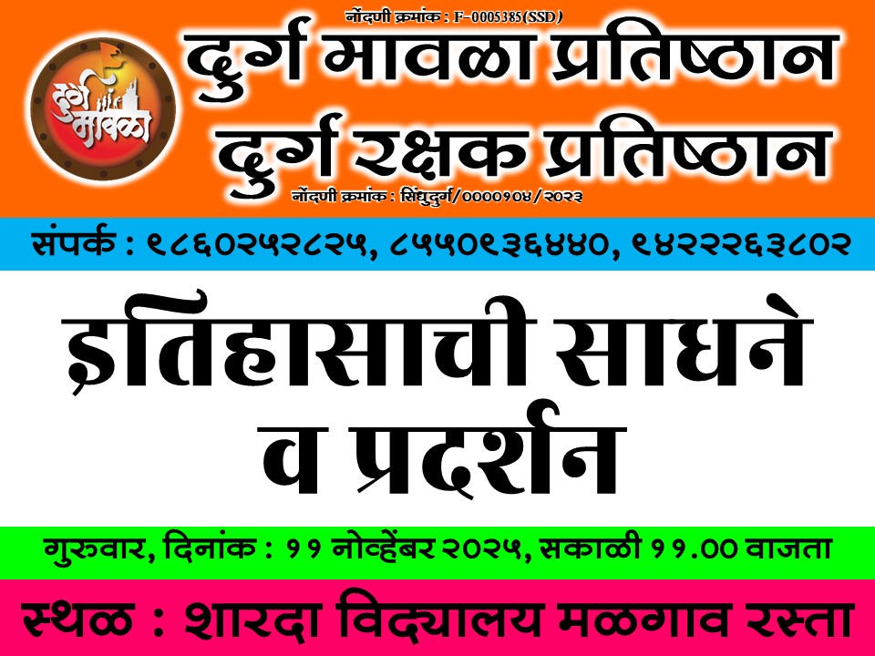 ⚡सावंतवाडी ता.१०-: मळगाव-रस्तावाडी अष्टविनायक कला क्रीडा मंडळ, दुर्ग मावळा प्रतिष्ठान व रेडी येथील दुर्ग रक्षक प्रतिष्ठान यांच्या संयुक्त विद्यमाने शिव प्रताप दिनाचे औचित्य साधून ऊद्या ११ नोव्हेंबर रोजी सकाळी ११ .०० ते दुपारी ०१.०० या वेळेत मळगाव येथील शारदा विद्यालय रस्ता शाळेत ऐतिहासिक शस्त्र प्रदर्शन व चौथीच्या इतिहास विषयाला अनुसरून शिबीर आयोजित करण्यात आले आहे. विद्यार्थ्यांशालेय विद्यार्थ्यांनी व शिवप्रेमींनी या शिबिराचा लाभ घ्यावा, असे आवाहन करण्यात आले आहे.
