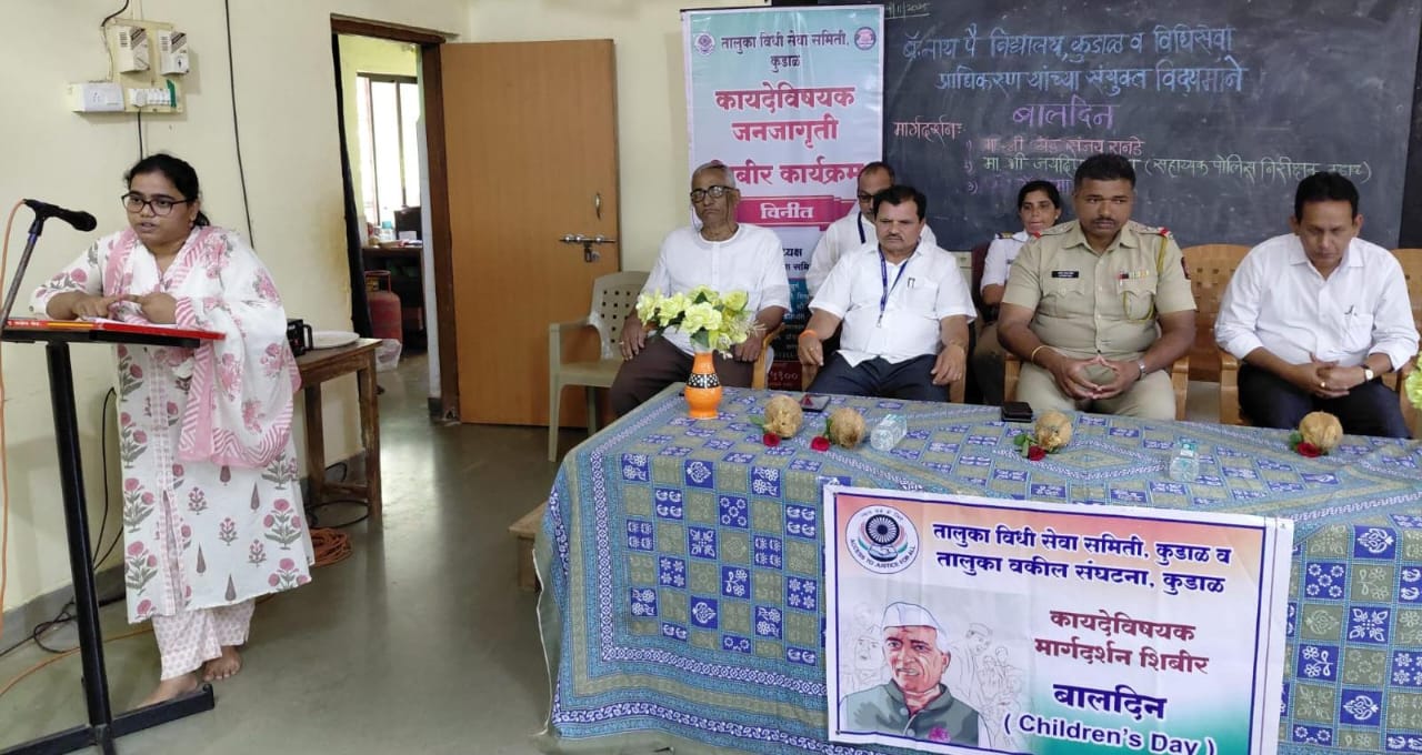कुडाळ : येथील दिवाणी न्यायालय तथा तालुका विधी सेवा समिती व तालुका वकील संघटना कुडाळ यांचे संयुक्त विदयमाने बॅ नाथ पै विदयालय कुडाळ येथे दिनांक १४ नोव्हेंबर २०२५ रोजी बालदिनाचे शिबीर कुडाळ दिवाणी न्यायालयचे दिवाणी न्यायाधीश तथा अध्यक्ष तालुका विधी सेवा समिती कुडाळ जी ए कुलकर्णी यांचे मार्गदर्शनाखाली आयोजीत करणेत आलेले होते. त्याला उत्स्फूर्त प्रतिसाद मिळाला.