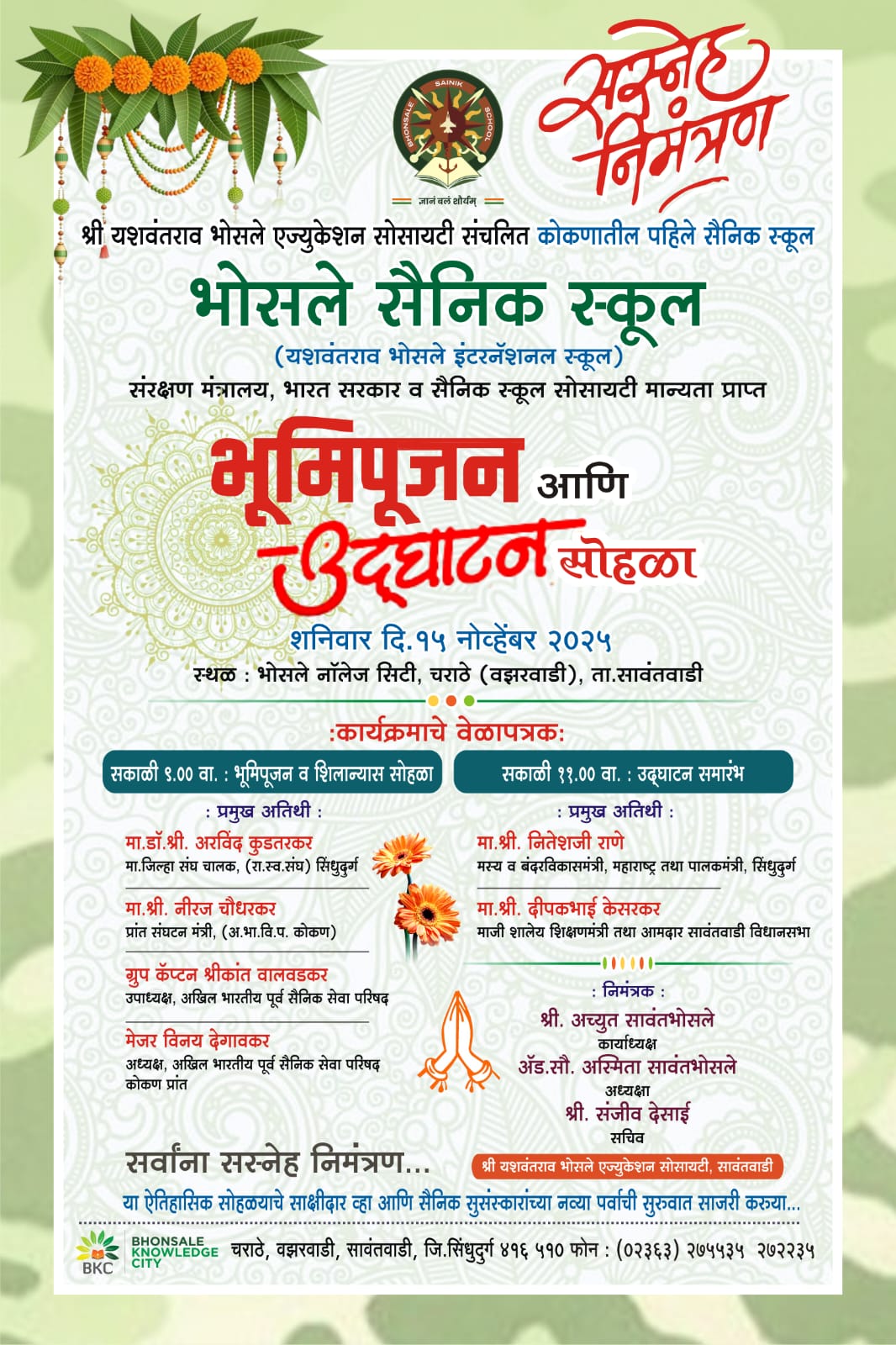 सावंतवाडी : श्री यशवंतराव भोसले एज्युकेशन सोसायटी संचलित भोसले सैनिक स्कूल (यशवंतराव भोसले इंटरनॅशनल स्कूल) भूमिपूजन आणि उद्घाटन सोहळा उद्या शनिवार १५ नोव्हेंबर रोजी भोसले नॉलेज सिटी, चराठे (वझरवाडी) येथे आयोजित करण्यात आला आहे.