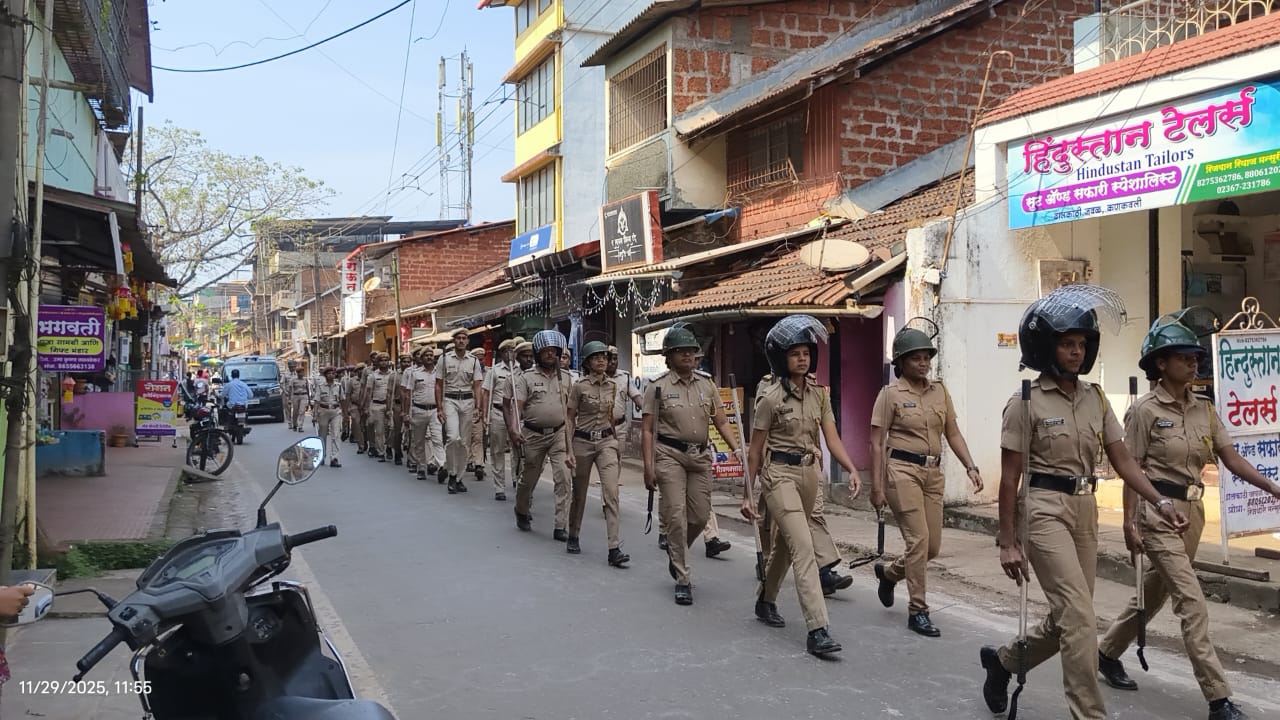 कणकवली : कणकवली नगरपंचायत निवडणुकीच्या पार्श्वभूमीवर शहरात कायदा व सुव्यवस्था राखण्यासाठी पोलीस बंदोबस्तात वाढ करण्यात आली आहे. कणकवली शहरातून पोलिसांनी संचालन केले यावेळी स्वतः डीवायएसपी घनश्याम आढाव पोलीस निरीक्षक नलावडे हे देखील या संचलनामध्ये सहभागी झाले होते. तसेच नरडवे रोड वर निवडणूक भरारी पथकाच्या फेरा वाढल्या आहेत. काही ठिकाणी नाकाबंदी देखील करण्यात आली आहे.