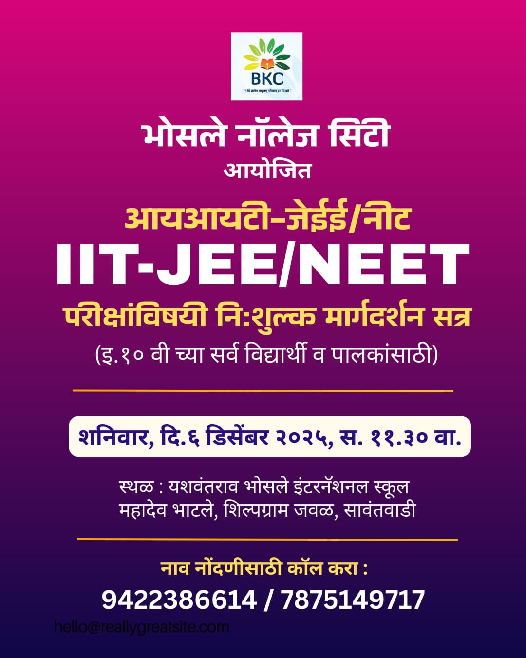 ⚡सावंतवाडी ता.०४-: इंजिनिअरिंग व मेडिकल क्षेत्रात प्रवेश घेऊ इच्छिणाऱ्या विद्यार्थ्यांसाठी तसेच त्यांच्या पालकांसाठी भोसले नॉलेज सिटीच्या वतीने शनिवार, 6 डिसेंबर 2025 रोजी विशेष मार्गदर्शन सत्राचे आयोजन करण्यात आलेले आहे. या सत्रामध्ये JEE व NEET परीक्षेची माहिती, तयारीची रणनीती, अभ्यास पद्धती, भविष्यातील प्रवेश प्रक्रिया याबाबत तज्ज्ञांकडून सविस्तर मार्गदर्शन केले जाणार आहे._