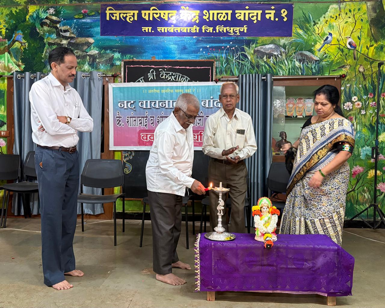 बांदा नट वाचनालय येथे आयोजित वक्तृत्व स्पर्धेचे दीपप्रज्वलन करून उदघाटन करताना मान्यवर.