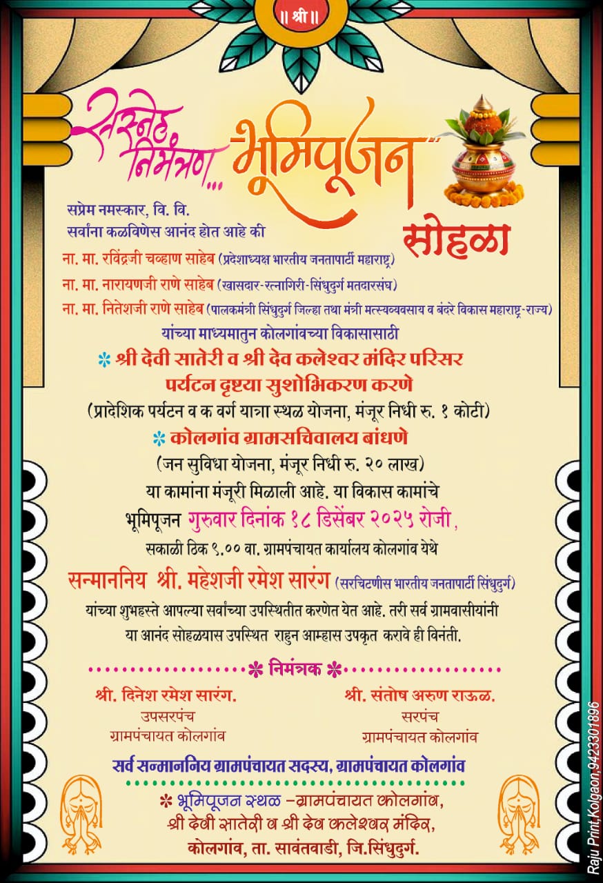 कोलगाव गावाच्या सर्वांगीण विकासासाठी मंजूर करण्यात आलेल्या महत्त्वपूर्ण विकासकामांचे भूमिपूजन गुरुवार दि. १८ डिसेंबर २०२५ रोजी सकाळी ९.०० वाजता ग्रामपंचायत कार्यालय, कोलगाव येथे संपन्न होणार आहे.