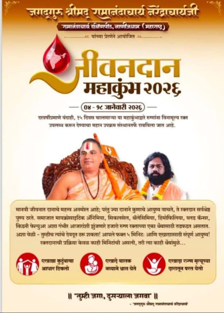 ⚡सावंतवाडी ता.०३-: जगद्गुरू श्री रामानंदाचार्य यांच्या मार्गदर्शनाखाली सावंतवाडी तालुक्याच्या वतीने जानेवारी महिन्यात विविध ठिकाणी रक्तदान शिबिरांचे आयोजन करण्यात आले आहे. या उपक्रमांतर्गत ४ जानेवारी रोजी इन्सुली – कोंडवाडा , ७ जानेवारी व्हि.पी.काॅलेज माडखोल, ११ जानेवारी मडूरे व आरोग्य केंद्र निरवडे आणि १८ जानेवारी रोजी विलवडे शाळा नंबर १ येथील सेवाकेंद्रांमध्ये रक्तदान शिबिर आयोजित करण्यात येणार आहे.
