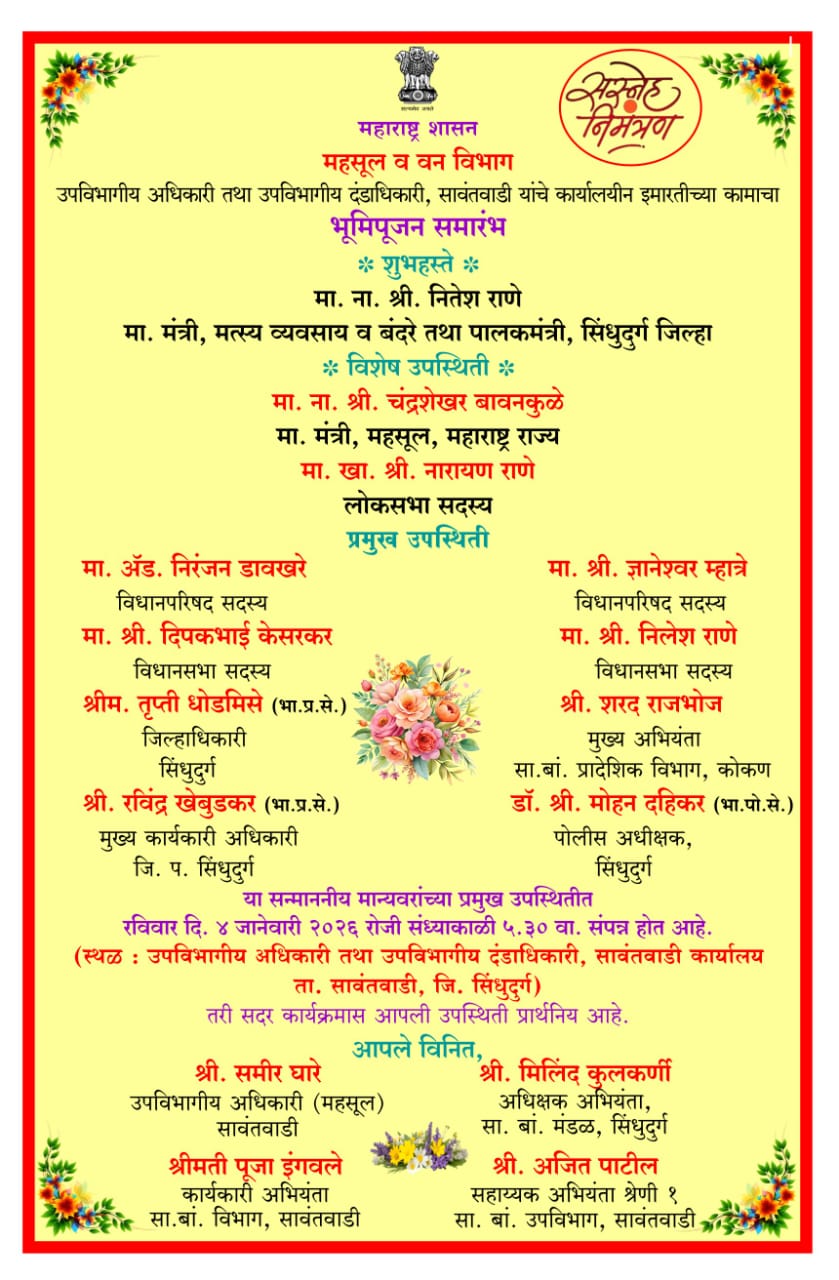 महाराष्ट्र शासनाच्या महसूल व वन विभागांतर्गत येथील उपविभागीय अधिकारी तथा उपविभागीय दंडाधिकारी कार्यालयाच्या नवीन प्रशासकीय इमारतीचा भूमिपूजन समारंभ रविवार, ४ जानेवारी २०२६ रोजी आयोजित करण्यात आला आहे. सायंकाळी ५:३० वाजता सावंतवाडी येथील कार्यालय परिसरात हा कार्यक्रम संपन्न होईल.