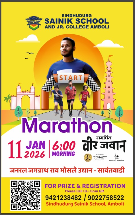 ⚡सावंतवाडी ता.१०-: उद्या रविवार ११ जानेवारी रोजी सिंधुदुर्ग सैनिक स्कूल, आंबोली व नगरपरिषद, सावंतवाडी यांच्या संयुक्त विद्यमाने सकाळी ०७.०० वाजता जनरल जगन्नाथराव भोसले उद्यान, सावंतवाडी येथे मॅरेथॉन स्पर्धेचे आयोजन करण्यात आले आहे. बक्षीस वितरण समारंभ सकाळी ०९.३० वाजता होणार आहे आहे. जास्तीत जास्त स्पर्धकांनी भाग घेण्याचे आवाहन आंबोली सैनिक स्कूल व नगरपरिषद यांच्यावतीने करण्यात आले आहे.