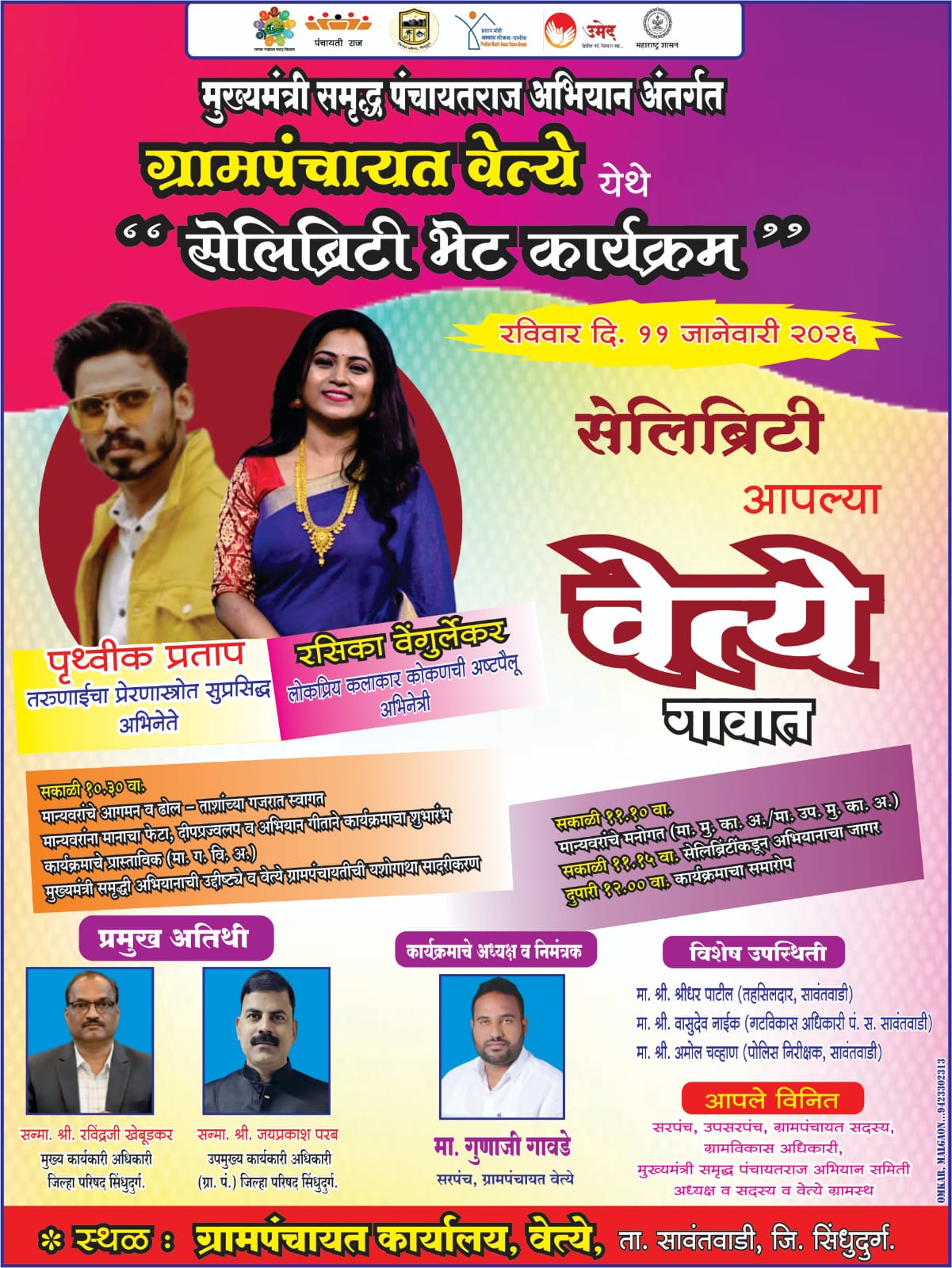 या कार्यक्रमासाठी तरुणाईचा प्रेरणास्रोत असलेले सुप्रसिद्ध अभिनेते पृथ्वीक प्रताप तसेच कोकणची अष्टपैलू अभिनेत्री रसिका वेंगुर्लेकर यांची प्रमुख उपस्थिती लाभणार असून ते ग्रामस्थांशी थेट संवाद साधणार आहेत.