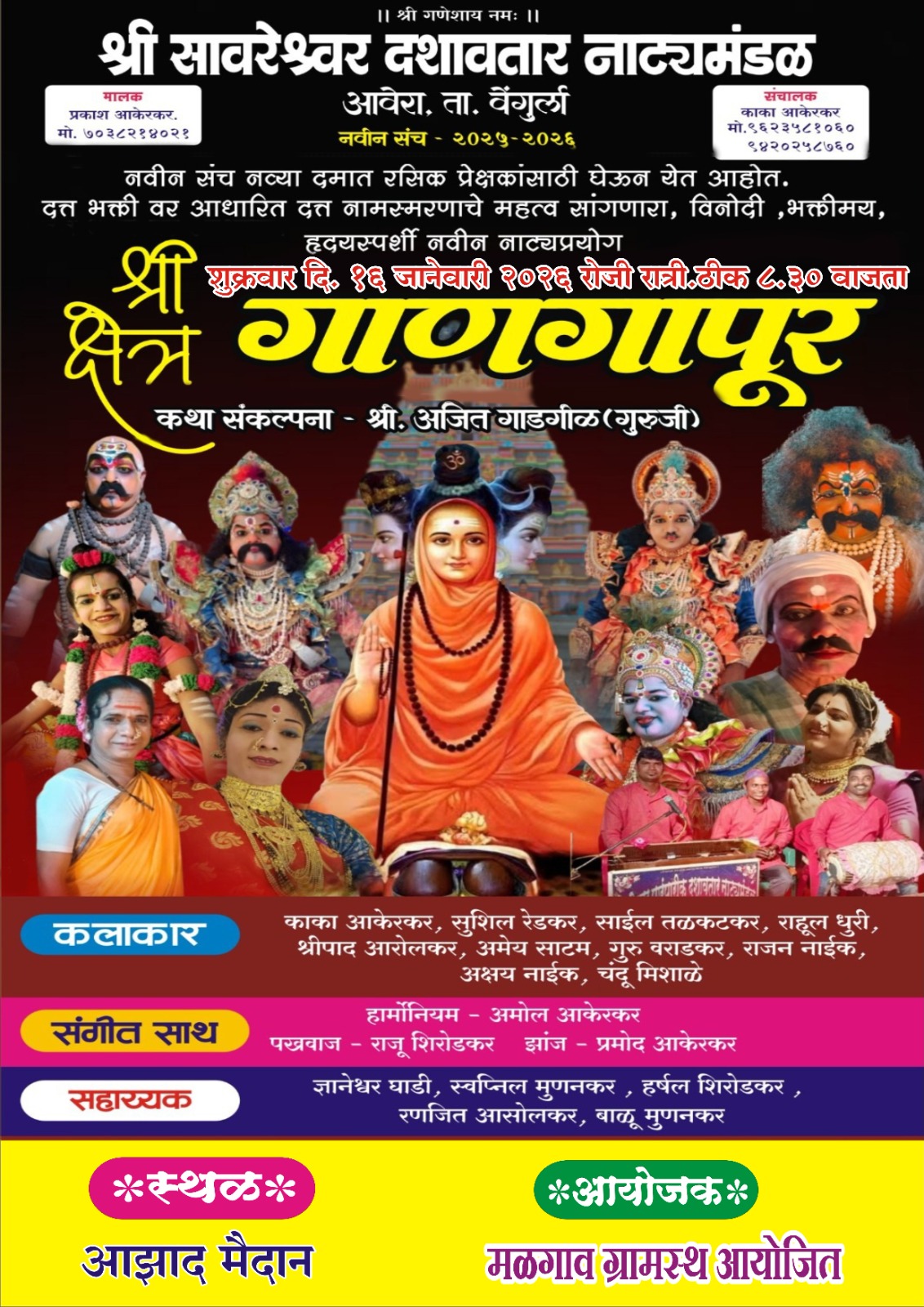 ⚡सावंतवाडी ता.१३-: मळगाव येथील आझाद मैदान येथे १६ जानेवारी रोजी रात्री ८.३० वाजता आवेरा वेंगुर्ला येथील श्री सावरेश्वर दशावतार नाट्यमंडळाचा दत्त नामस्मरणाचे महत्व सांगणारा ‘श्रीक्षेत्र गाणगापूर’ दशावतार नाट्यप्रयोगाचे आयोजन मळगाव ग्रामस्थांच्यावतीने करण्यात आले आहे.