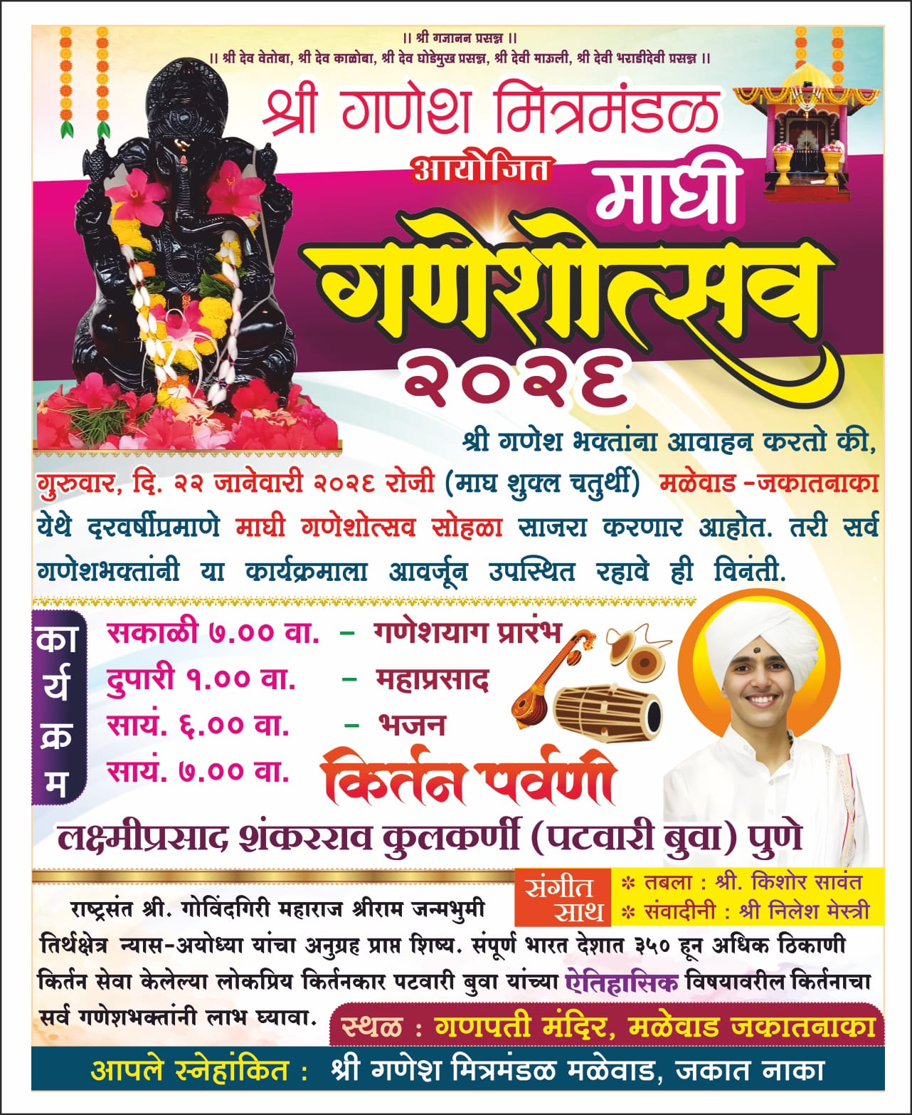 ⚡सावंतवाडी ता.१९-: मळेवाड जकात नाका येथील श्री गणेश मित्रमंडळ आयोजित गुरुवार दि.२२ जानेवारी रोजी श्री गणेश मंदिरात माघी गणेश जयंती निमित्त विविध कार्यक्रमांचे आयोजन करण्यात आले आहे.