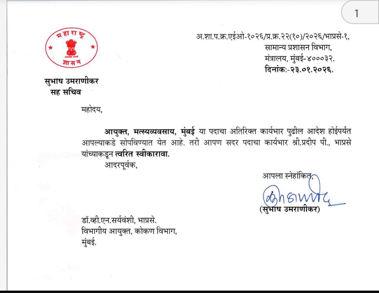 सामान्य प्रशासन विभाग, मंत्रालय, मुंबई यांच्याकडून २३ जानेवारी २०२६ रोजी जारी करण्यात आलेल्या पत्रानुसार, सदर पदाचा अतिरिक्त कार्यभार तात्काळ स्वीकारण्याचे निर्देश देण्यात आले आहेत. यापूर्वी आयुक्त, मत्स्यव्यवसाय, मुंबई या पदाचा कार्यभार श्री. प्रदीप पी. (भाप्रसे) यांच्याकडे होता.