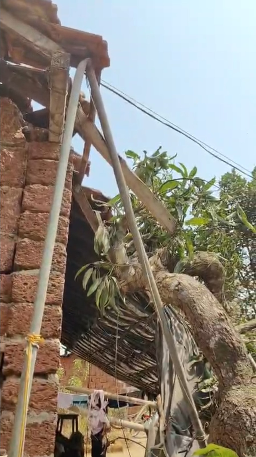 कांदळगाव देऊळवाडी परिसरातील जयराम परब यांच्या घरा शेजारी जुने मोठे हापूस आंब्याचे कलम मुळातून कमजोर झाले होते. रविवारी हे झाड अचानक कोसळून परब कुटूंबियांच्या घराचे नुकसान झाले. झाड कोसळल्यावर स्थानिक ग्रामस्थ जीवन कांदळगांवकर, जयवंत राणे, रोहन राणे, शांताराम चव्हाण, गीतेश कोदे यांनी घटनास्थळी धाव घेत परब कुटुंबियांची चौकशी केली. सुदैवाने या घटनेत कोणतीही जीवितहानी झाली नाही. मात्र, जयराम परब यांच्या घरासमोरील अंगणात उभ्या करून ठेवलेल्या मोटर सायकलचे आणि घराच्या दर्शनी भागाचे मिळून सुमारे ५० हजार रुपयाचे नुकसान झाले आहे. कांदळगाव तलाठी यांनी घटनेचा सोमवारी पंचनामा करून नुकसानीची नोंद केली.