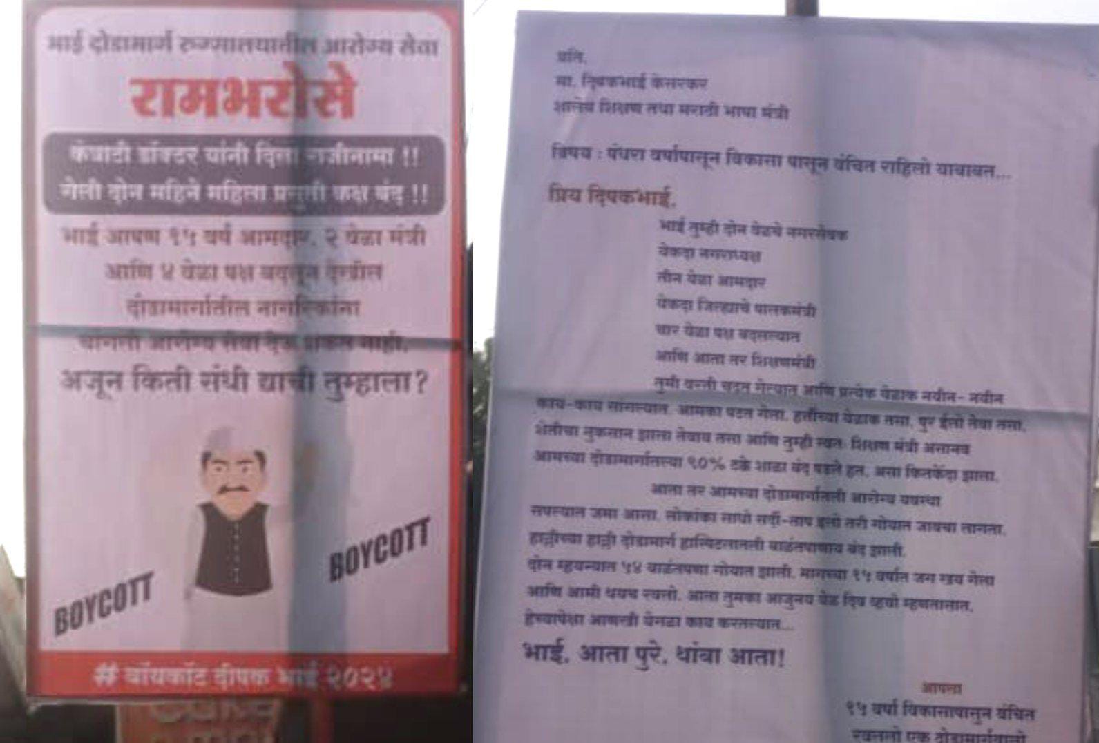 १५ वर्ष विकासापासून वंचित रखलेलो एक दोडामार्गवालो अशा नावाने हे बॅनर दोडामार्ग येथे झळकत आहेत. २ ठिकाणी हे बॅनर लावण्यात आले आहे. यात भाई दोडामार्ग रुग्णालयातील आरोग्य सेवा रामभरोसे, कंत्राटी डॉक्टरांनी दिला राजीनामा, गेली दोन महिने महिला प्रसूची कक्ष बंद “बायकॉट दीपक भाई” अशा आशयाचा उल्लेख करण्यात आला आहे. दिवाळीच्या आदल्या दिवशी दीपक केसरकर यांनी आपण पुन्हा विधानसभा निवडणूक लढणार असल्याचे जाहीर केले होते. काही जण मी खासदारकी लढवणार असल्याचे सांगून आपली बदनामी करत आहेत. मात्र काही झाले तरी आपण पुन्हा एकदा ही निवडणूक लढणार, असा दावा त्यांनी केला. या पार्श्वभूमीवर केसरकर विरोधकांकडून हे बॅनर लागल्याची चर्चा आहे