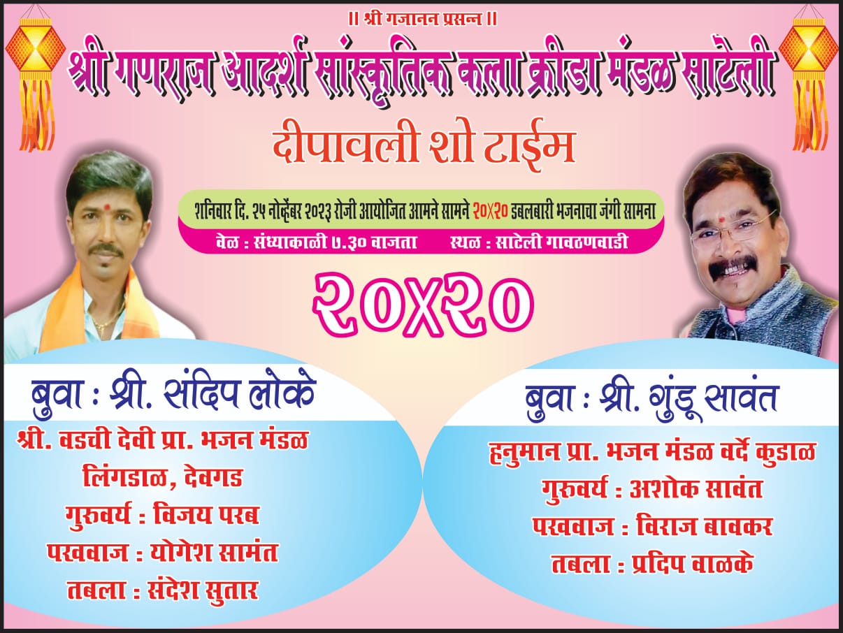 तरी सर्व भजन प्रेमींनी या आमने-सामने २०×२० डबलबारी भजनाच्या जंगी सामन्याला उपस्थित रहावे असे आवाहन श्री गणराज आदर्श सांस्कृतिक कला क्रीडा मंडळ साटेली यांच्या कडून करण्यात आले आहे.