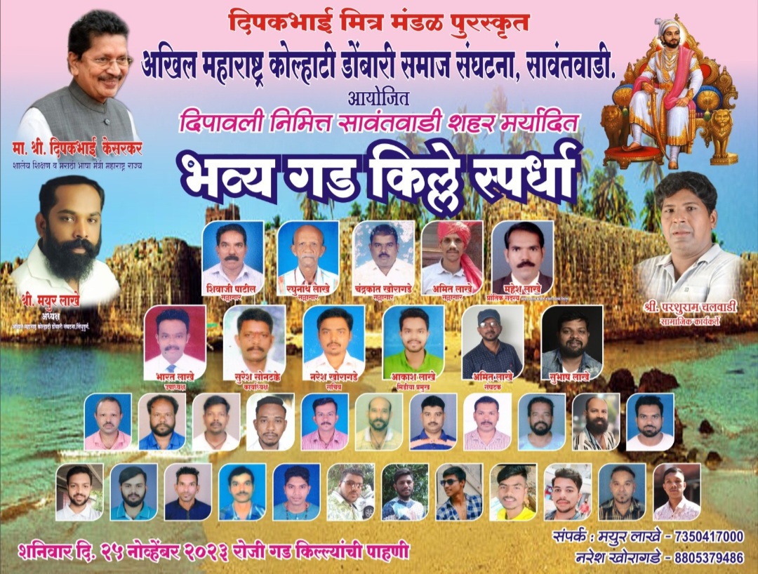 ⚡सावंतवाडी ता.२१-: येथील दीपक भाई मित्र मंडळ पुरस्कृत अखिल महाराष्ट्र कोल्हाटी डोंबारी समाज संघटना यांच्या वतीने दिपवाळी निमित्त शहर मर्यादित भव्य गड किल्ले स्पर्धेच आयोजन करण्यात आले आहे.