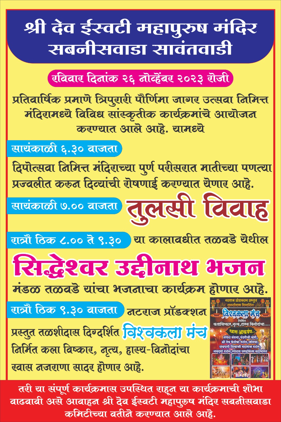 सायंकाळी ७.०० वाजता तुलसी विवाह, रात्री ८.०० ते ९.३० या कालावधीत तळवडे येथील सिद्धेश्वर उद्दीनाथ भजन मंडळाचा भजनाचा कार्यक्रम होणार आहे. रात्री ९.३० वाजता नटराज प्रॉडक्शन प्रस्तुत तळशीदास दिग्दर्शित व विश्वकला मंच निर्मित कला विष्कार, नृत्य, हास्य-विनोदांचा खास नजराणा सादर होणार आहे. या सर्व कार्यक्रमास उपस्थित राहून या कार्यक्रमाची शोभा वाढवावी, असे आवाहन श्री देव ईस्वटी महापुरुष मंदिर कमिटीच्यावतीने करण्यात आले आहे.