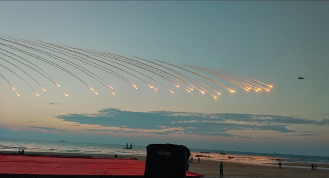 आज सायंकाळीं पाच वाजता नौदलाचे मरीन कमांडो आकाशात पॅराशुट मधून खाली उतरत नौदलाच्या सरावाला सुरुवात झाली. निश्चित केलेल्या पॉइंट वर एका मागोमाग एक असे आकाशातू भारताच तिरंगा आणि नौदलाचा ध्वज फडकवत पॅराशुट द्वारे कमांडो खाली जमिनीवर उतरले. या नंतर आकाशात तेजस, डॉर्निअर, मिग २९ के आदी एअरक्राफ्टनी आपल्या कसरती दाखविल्या. तारकर्लीच्या आकाशात लडाऊ विमानांनी कसरती चालू झाल्या नंतर त्यांच्या आवाजाने आसमंत दणाणून गेला होता.