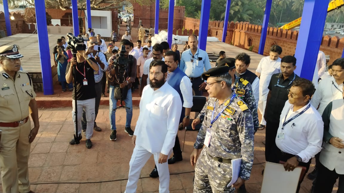 ⚡सिंधुदुर्गनगरी ता.३०-: मालवण किनाऱ्यावरील राजकोट येथे ४ डिसेंबर रोजी नौसेना दिनाच्या निमित्ताने छत्रपती शिवाजी महाराजांच्या पुतळ्याचे अनावरण होणार आहे. हा कार्यक्रम प्रधानमंत्री नरेंद्र मोदी यांच्या प्रमुख उपस्थितीत होणार आहे. या कार्यक्रमाच्या पूर्वतयारीची पाहणी करून मुख्यमंत्री एकनाथ शिंदे यांनी आढावा घेतला. यावेळी उद्योग मंत्री उदय सामंत, शालेय शिक्षण मंत्री दिपक केसरकर, विभागीय आयुक्त डॉ महेंद्र कल्याणकर, जिल्हाधिकारी किशोर तावडे, मुख्य कार्यकारी अधिकारी प्रज्योत नायर, पोलीस अधिक्षक सौरभ अग्रवाल तसेच नौदलाचे अधिकारी उपस्थित होते.