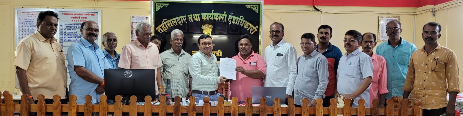 तहसीलदार श्रीधर पाटील यांना एक निवेदन दिले आहे.त्यात म्हटले आहे,केंद्रसरकारच्या हमीभाव योजनेअंतर्गत मिळणा-या चांगल्या हमीभावामुळे शेतक-यांना खूप फायदा झाला आहे. परंतू गेली २ वर्षे ई-पीक नोंदणीच्या जाचक अटीमुळे सदर खरेदीमध्ये खूप अडचणी येत आहेत. सदर ईपीक नोंदणीसाठी व खरेदीमधील येणा-या अडचणीबाबत वारंवार पत्रव्यवहार करावा लागत आहे. आज ई-पीक नोंदणीचे ७/१२ शेतक-यांना उपलब्ध होत नाहीत. त्यामुळे गरीब परिस्थितीत शेतक-यांचे धान खाजगी व्यापारी कमी किंमतीत घेत आहेत. सदर ई-पीक पे-याची नोंद गावपातळीवर सक्तीची न राबविल्यामुळे व शेतकरी कामात व्यस्त असल्यामुळे शेतक-यांना खरीप हंगाम पीकाची नोंद करता आली नाही. सद्यस्थितीत खरीप हंगामाची नोंद होत नसल्यामुळे शेतकरी भाताची नोंदणी करु शकत नाही. बरेच शेतकरी या योजनेपासून वंचित राहत असल्यामुळे सदरची खरीप हंगाम ई-पीक नोंद ही ऑफलाईन पध्दतीने देण्याची व्यवस्था करण्यात यावी. संघाकडून गतवर्षी १६०० शेतक-यांची नोंदणी झाली होती. परंतू यावर्षी आतापर्यत ८५० शेतक-यांची नोंद झालेली आहे. उर्वरीत ७५० शेतक-यांची खरीपचा पीक पेरा न झालेमुळे नोंद होणे शिल्लक आहे. तरी आपलेस्तरावर योग्य ती कार्यवाही होऊन वंचित शेतक-यांना न्याय मिळावा अशी मागणी करण्यात आली आहे.