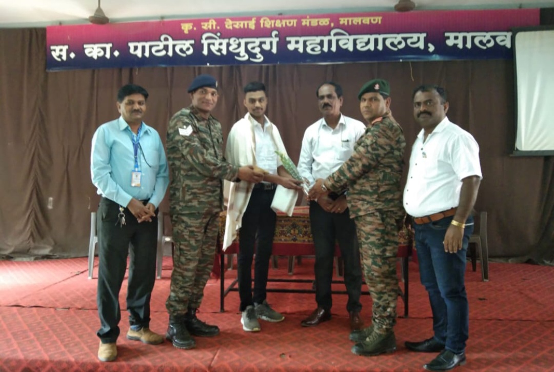 मालवण येथील स.का. पाटील सिंधुदुर्ग कॉलेजचा राष्ट्रीय छात्र सेना (NCC)विभागाचा एनसीसी कॅडेट शुभम साळुंखे हा नुकताच भारतीय सैन्य दलात भरती झाला आहे. सध्या त्याची ट्रेनिंग पूर्ण होऊन तो भारत चीन सीमेवर गलवान या ठिकाणी देशाच्या रक्षणासाठी दाखल झालेला आहे. तो आज मालवण येथे आल्यानंतर कॉलेजच्यावतीने त्याचा शाल श्रीफळ व पुष्पगुच्छ देऊन सत्कार करण्यात आला यावेळी एनसीसी विभाग प्रमुख लेफ्टनंट प्रा.डॉ एम आर खोत.,58 महाराष्ट्र बटालियन चे सुभेदार महेंद्र व पटेल, कैलास साळुंखे डॉ. सुमेधा नाईक डॉ उज्वला सामंत, ओ .एस.कैलास साळुंखे डॉ.हंबीरराव चौगुले श्रीमती सुचिता बेलेकर , तृप्ती चव्हाण, प्रा. अनुराधा गावडे प्रा . रेशमी राऊळ .प्रा संग्राम पवार आदी मान्यवर उपस्थित होते