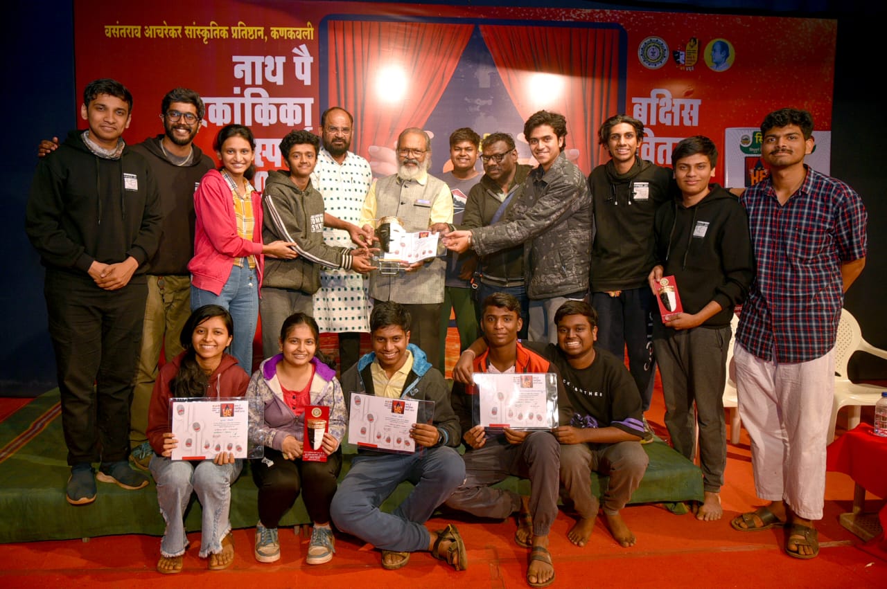 ⚡कणकवली ता.२८-: वसंतराव आचरेकर प्रतिष्ठान आयोजित ४६ व्या नाथ पै एकांकिका स्पर्धेतील खुल्या गटात मराठवाडा मित्रमंडळ वाणिज्य महाविद्यालय, पुणेच्या ‘सिनेमा’ने प्रथम क्रमांक पटकाविला. गायन समाज देवल क्लब, कोल्हापूरच्या ‘बीईंग अँड नथिंग’ ने द्वितीय तर ढ मंडळी कुडाळच्या ‘डीम टँग डीटँग’ने तृतीय क्रमांक पटकाविला.
