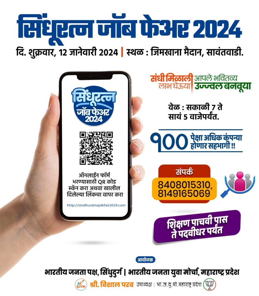 ⚡सावंतवाडी ता.०४-: भारतीय जनता युवा मोर्चा उपाध्यक्ष विशाल परब यांच्या माध्यमातून सावंतवाडी जिमखाना मैदानावर 12 जानेवारी रोजी होणाऱ्या सिंधू रत्न जाॅब फेअर २०२४ मध्ये सहभागी होण्यासाठी मोठ्या प्रमाणात युवक युवतीचा प्रतिसाद मिळत असून आत्तापर्यंत अनेकांनी क्युआर कोड व ऑफलाईन पध्दतीने फाॅर्म भरुन आपला प्रवेश निश्चित केला आहे. तरी जास्तीत जास्त बेरोजगार युवक युवतीनी या जाॅब फेअरची संधी उपलब्ध करुन घ्यावी असे आवाहन श्री विशाल परब यांनी केले आहे.