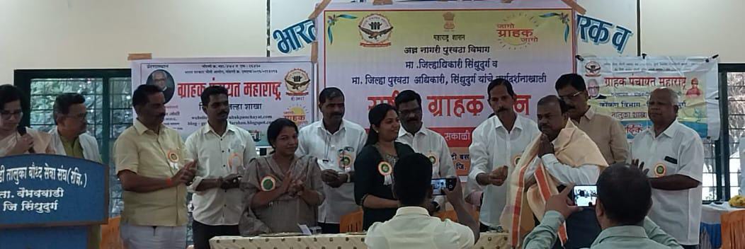 वैभववाडी येथील आंबेडकर भवन येथील जिल्हास्तरीय ग्राहक दिन कार्यक्रमात उपजिल्हाधिकारी आरती देसाई यांचे शुभहस्ते जिल्हा ग्राहक पंचायतीच्या माध्यमातून सीताराम उर्फ दादा कुडतरकर यांचा स्मृतीचिन्ह,मानपत्र,शाल श्रीफळ देऊन भव्य सत्कार करून गौरव करण्यात आला.यावेळी तहसीलदार दीप्ती देसाई,नायब तहसीलदार भावना शिंदे,ग्राहक पंचायतीचे जिल्हाध्यक्ष प्रा. सुरेश पाटील, तालुकाध्यक्ष तेजस साळुंके,नासिर काझी,भालचंद्र साठे,जयेंद्र रावराणे,संजय सावंत, महेश संसारे,कणकवली तालुकाध्यक्ष सौ श्रद्धा कदम,गीतांजली कामत, पूजा सावंत,पत्रकार, सामाजिक कार्यकर्ते,जेष्ठ नागरिक अन इतर मान्यवर बहुसंख्येने आवर्जून उपस्थित होते.