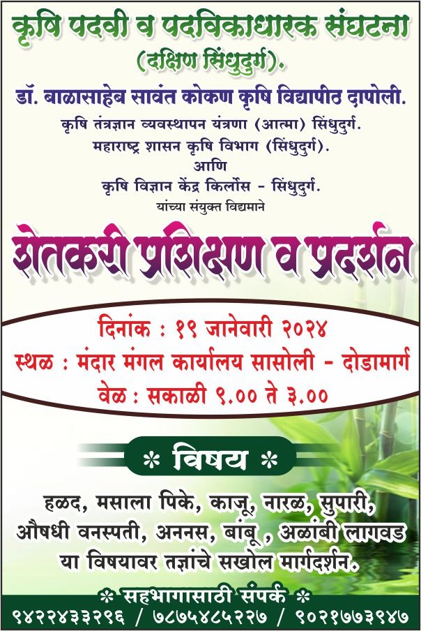 हे आयोजन सासोली येथील मंदार मंगल कार्यालय येथे सकाळी ९ ते दु.३ वाजेपर्यंत असणार आहे. यावेळी कोकणातील सर्वच पिकांबाबत मार्गदर्शन करण्यात येणार आहे. यामध्ये हळद, मसाला पिके, काजू, नारळ, सुपारी, औषधी वनस्पती, अननस, बांबू, अळंबी लागवड या विषयावर तज्ज्ञांचे सखोल मार्गदर्शन असणार आहे. या प्रशिक्षणाचा लाभ शेतकऱ्यांनी घ्यावा.