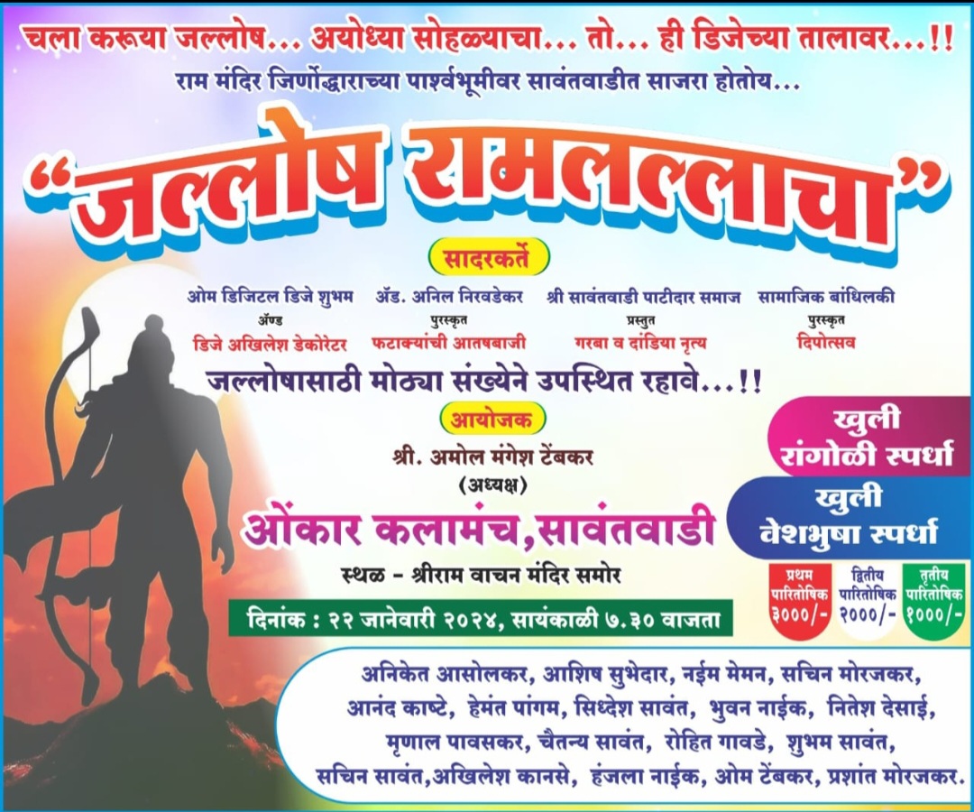 ⚡सावंतवाडी,ता.२०-: ओंकार कलामंचाच्या माध्यमातून सावंतवाडीत आयोजित करण्यात आलेल्या “जल्लोष रामलल्लाचा” या कार्यक्रमाच्या पार्श्वभूमीवर “रिल्स” स्पर्धेचे आयोजन करण्यात आले आहे. श्रीराम वाचन मंदिराच्या समोर होणार्या जल्लोष रामलल्लाचा या कार्यक्रमाचे व्हिडीओ त्यात असणे बंधनकारक असणार आहे.