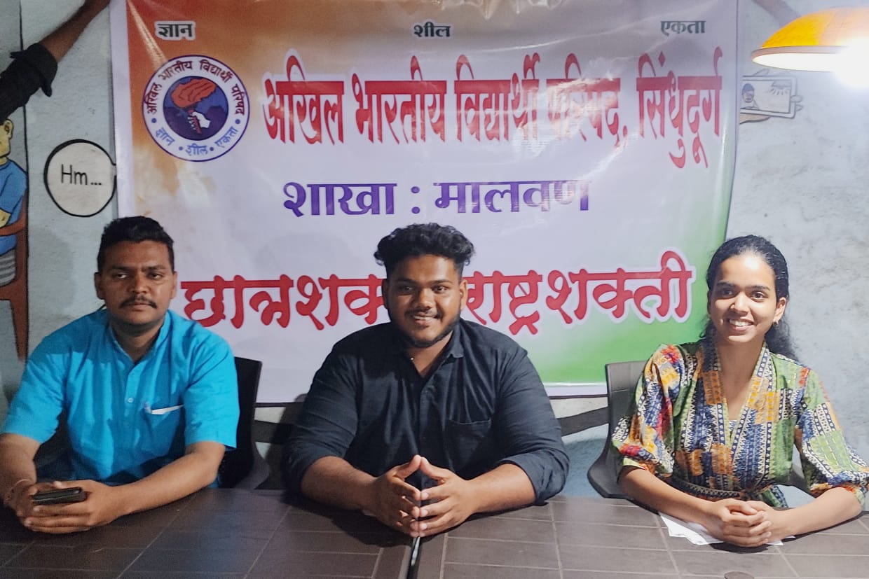 मालवण भरड येथे आयोजित पत्रकार परिषदेत अभाविपचे मालवण शहर मंत्री शुभम सकपाळ व राष्ट्रीय कार्यकारिणी सदस्य शिवाजी भावसार यांच्यासह कार्यक्रम प्रमुख मेगल डिसोजा व इतर विद्यार्थी कार्यकर्ते उपस्थित होते.