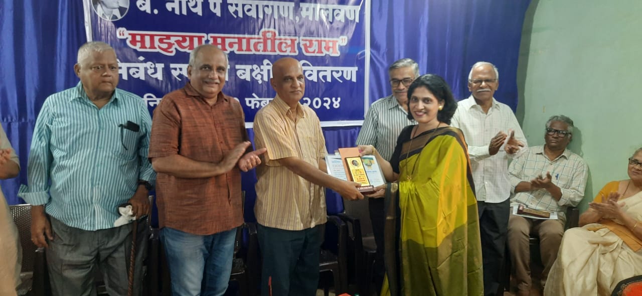 ⚡ओरोस ता.१०-: बॅरिस्टर नाथ पै सेवांगण मालवण यांच्यावतीने आयोजित करण्यात आलेल्या “माझ्या मनातील राम” या निबंध स्पर्धेत डॉ दर्शना कोलते यांनी प्रथम क्रमांक मिळविला. तर अदिती पै आणि सतीश लळीत यांनी अनुक्रमे द्वितीय आणि तृतीय क्रमांक मिळविला. या स्पर्धेचे बक्षीस वितरण अध्यक्ष ऍड देवदत्त परुळेकर आणि परीक्षक प्रसाद घाणेकर यांच्या प्रमुख उपस्थितीत पार पडले.