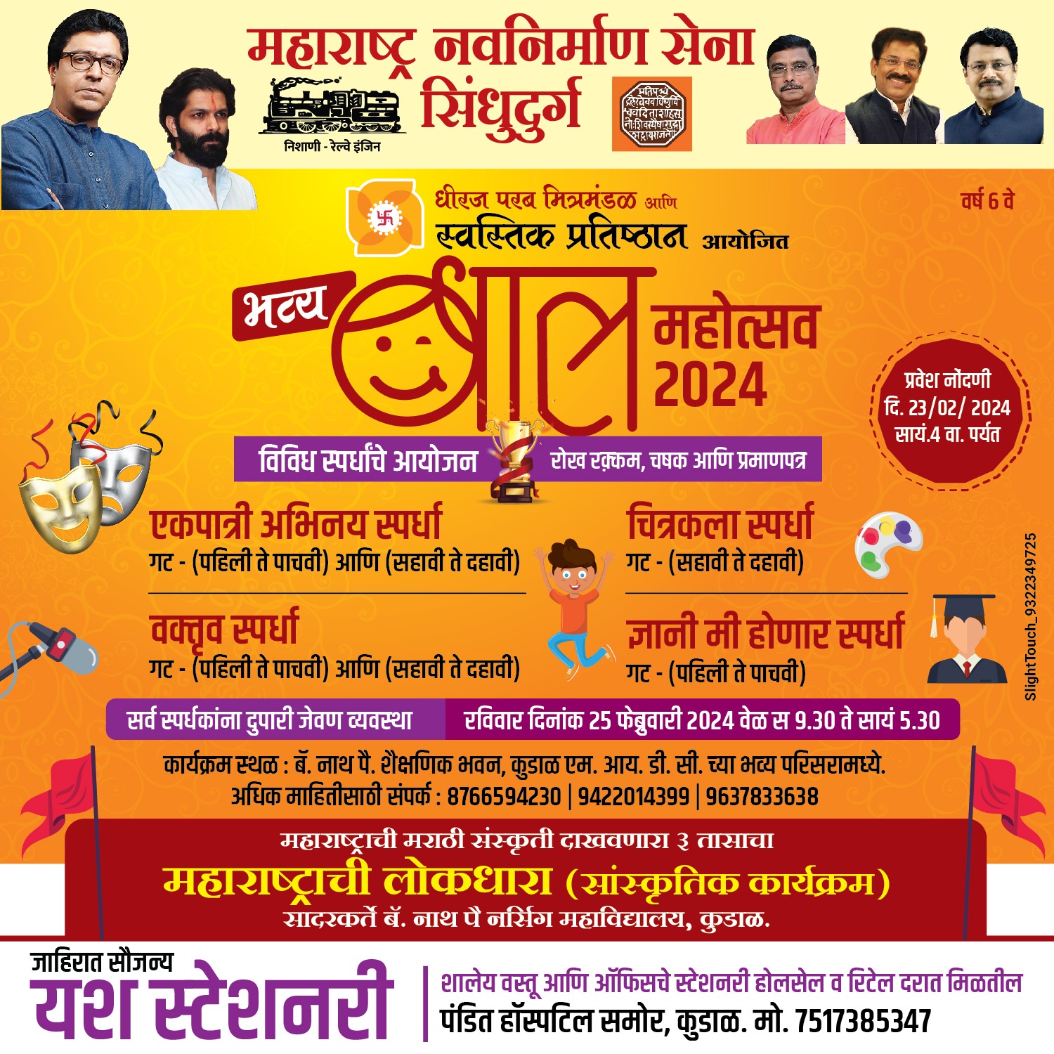 ⚡कुडाळ ता.१५-: महाराष्ट्र नवनिर्माण सेना आणि स्वस्तिक प्रतिष्ठान, कुडाळ यांच्या संयुक्त विद्यमाने भव्य बालमहोत्सवाचे आयोजन केले आहे. यामध्ये पहिली ते दहावी वयोगटातील विद्यार्थ्यांच्या विविध स्पर्धाचे आयोजन केले आहे. सकाळी ९.३० वा. रजिस्ट्रेशन करुन ५.३० पर्यंत स्पर्धा आणि सांस्कृतिक कार्यक्रम ठेवण्यात आले आहेत.