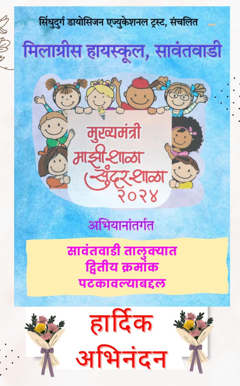 ⚡सावंतवाडी ता.२८-: महाराष्ट्र शासनाच्या वतीने संपूर्ण राज्यात ‘मुख्यमंत्री माझी शाळा सुंदर शाळा ‘उपक्रम राबविण्यात येत असून माध्यमिक विभागामध्ये सावंतवाडी तालुक्यातील मिलाग्रिस हायस्कूल ला तालुकास्तरीय मूल्यमापन समितीच्या परीक्षण अहवालात सावंतवाडी तालुक्यात द्वितीय क्रमांक प्राप्त झाला आहे. ‘मुख्यमंत्री माझी शाळा सुंदर शाळा’ उपक्रमा अंतर्गत मूल्यमापन समितीच्या निकालानुसार विजेत्या शाळांना रोख रकमेची पारितोषिके देखील शासनाने जाहीर केलेली आहेत. प्रशालेच्या या दैदिप्यमान यशाबद्दल प्रशालेचे सर्व स्तरातून अभिनंदन होत आहे.प्रशालेचे मुख्याध्यापक फादर रिचर्ड सालदान्हा यांनी शिक्षण संस्थेचे सर्व संचालक मंडळ सदस्य, शिक्षक व शिक्षकेतर कर्मचारी घेत असलेले परिश्रम तसेच विद्यार्थी व पालकांचे सहकार्य यामुळे आपल्या शाळेला हे यश मिळाले असल्याची प्रतिक्रिया दिली.